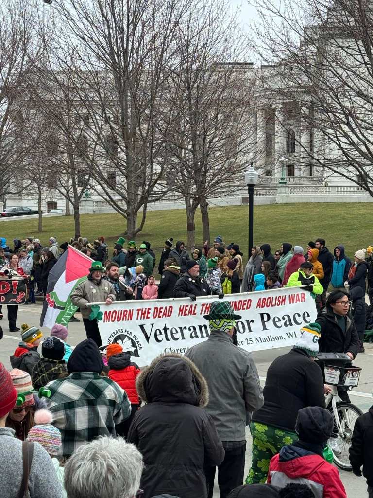 Categories Uncategorized Madison: Veterans for Peace in St. Patrick’s Day Parade – Free Palestine! – Money for People’s Needs Not Endless U.S. Wars! Post author By wibailoutpeople Post date March 17, 2024 Veterans For Peace in St. Patrick’s Day parade in Madison March 17, 2024. / Free Palestine! Share this: Click to share on X (Opens in new window) X Click to share on Facebook (Opens in new window) Facebook Like Loading... Related ← Wisconsin: March 18 – 24, 2024 Stand for Peace / Free Palestine Events → NYC, March 21, 2024: Memorial Tribute for Ralph Poynter