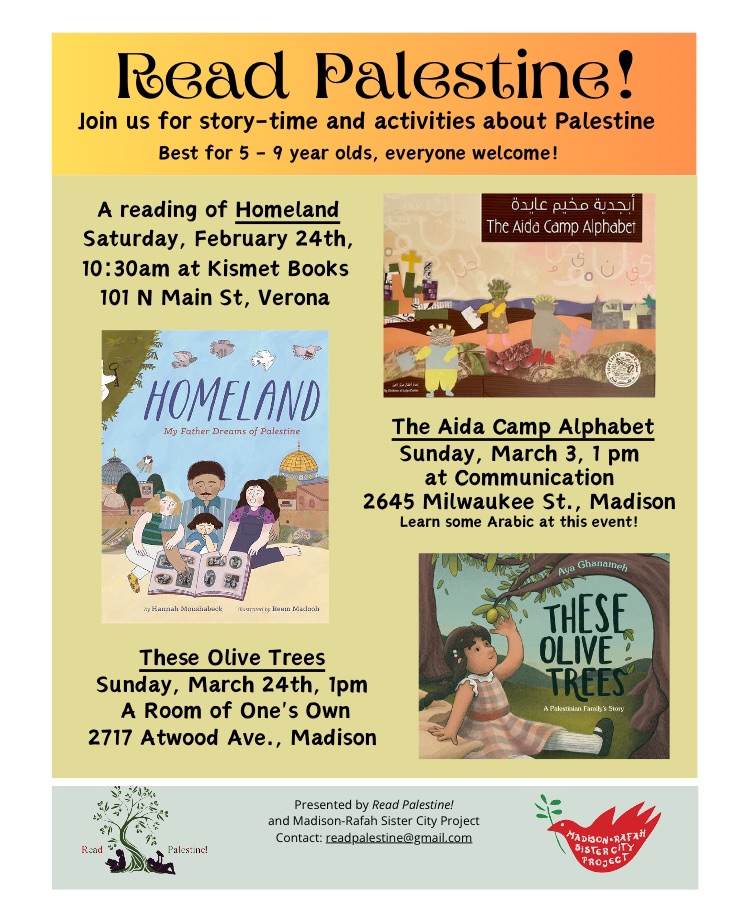 Categories Uncategorized Madison, March 24, 2024: Read Palestine! – ‘These Olive Trees’ Post author By wibailoutpeople Post date March 19, 2024 Madison-Rafah Sister City Project Facebook Event: https://fb.me/e/1UcH7XlY5 Share this: Click to share on X (Opens in new window) X Click to share on Facebook (Opens in new window) Facebook Like Loading... Related ← Madison, March 30, 2024: Aaron Bushnell Memorial – Free Palestine! → Madison, May 16, 2024: Worker Justice Wisconsin: Faith Labor Breakfast – “Sprouting the Seeds of Solidarity!”
