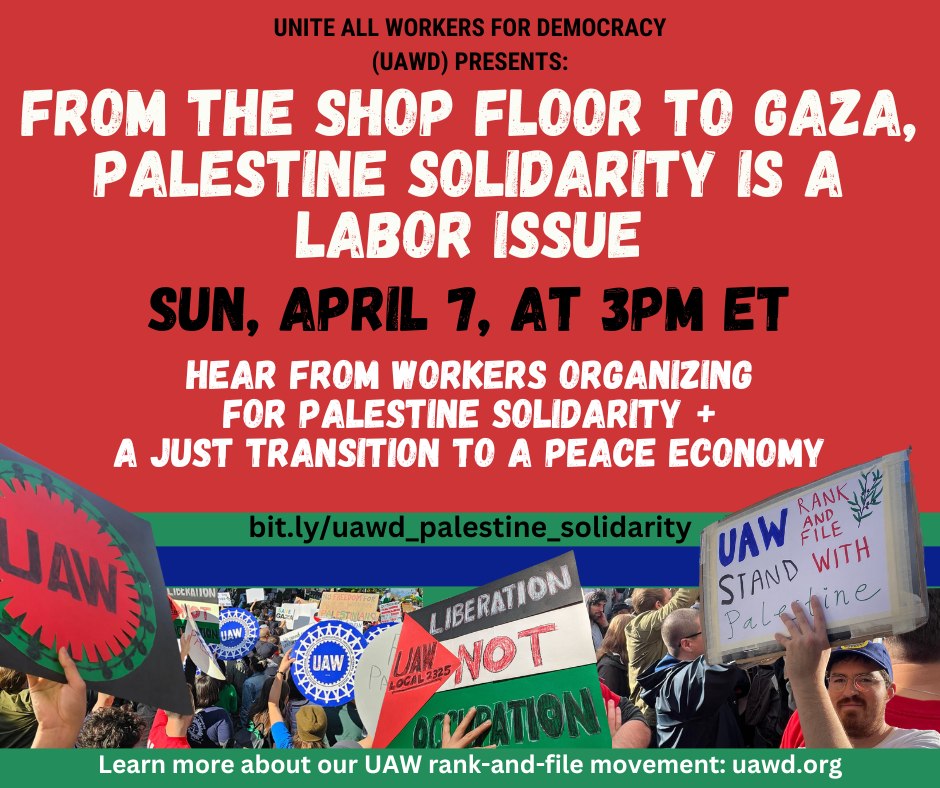 Join UAWD for our event, From the Shop Floor to Gaza, Palestine Solidarity is a Labor Issue, on Sunday, April 7 at 3 pm ET.