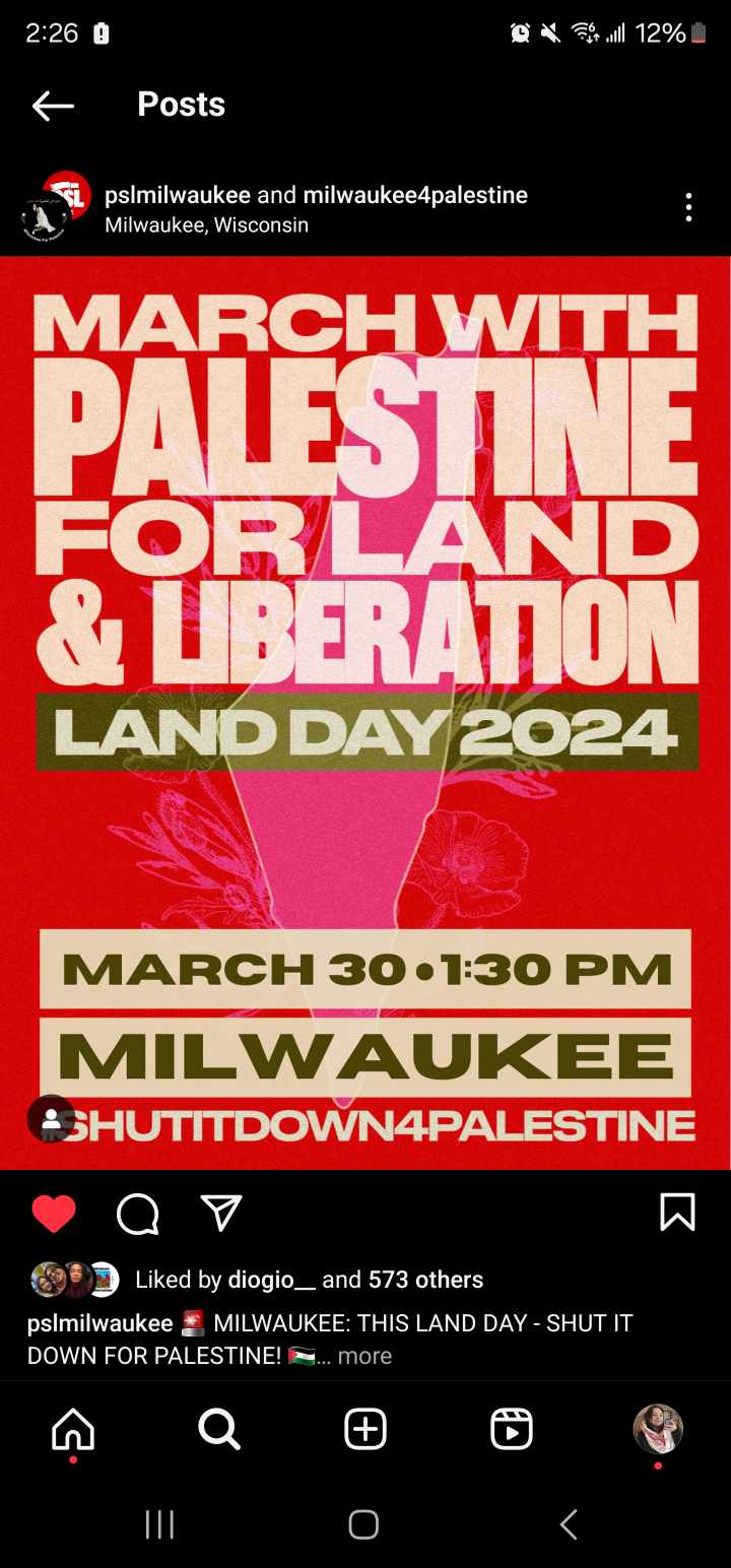 Categories Uncategorized Milwaukee, March 30, 2024: March with Palestine for Land & Liberation! Post author By wibailoutpeople Post date March 26, 2024 Share this: Share on X (Opens in new window) X Share on Facebook (Opens in new window) Facebook Like Loading... Related ← Venezuela & ALBA News → Wisconsin: Vote Early for 2024 Spring Election