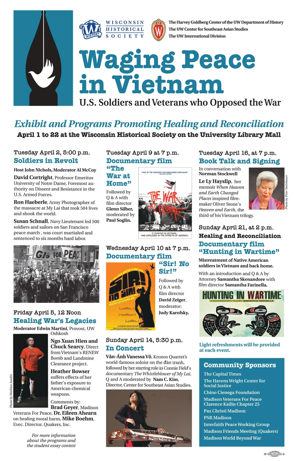 Categories Uncategorized April 1-22, 2024: ‘Waging Peace in Vietnam:’ U.S. Soldiers and Veterans who Opposed the War (Madison, Milwaukee, Oshkosh) Post author By wibailoutpeople Post date March 28, 2024 Waging Peace in Vietnam Click here to see Madison-only information Share this: Share on X (Opens in new window) X Share on Facebook (Opens in new window) Facebook Like Loading... Related ← March 30, 2024: Stand for Peace, Free Palestine events in Madison, Milwaukee, Racine, Viroqua → Higher Ed Labor United
