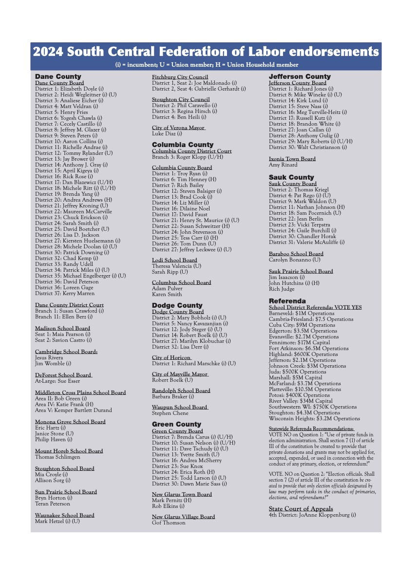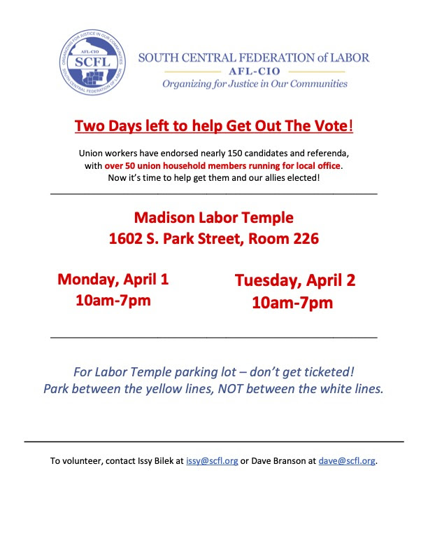 Don’t forget to VOTE for UNION Endorsed Candidates, many of whom are union members themselves!!!!Election Day is Tuesday, April 2. To find your polling place, go to https://myvote.wi.gov/en-us/.