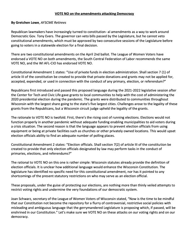 See the attachments for Labor’s endorsements and how to help Get Out The Vote! We’ve attached a story from Union Labor News explaining why to VOTE NO for the two Statewide Constitutional Amendments.