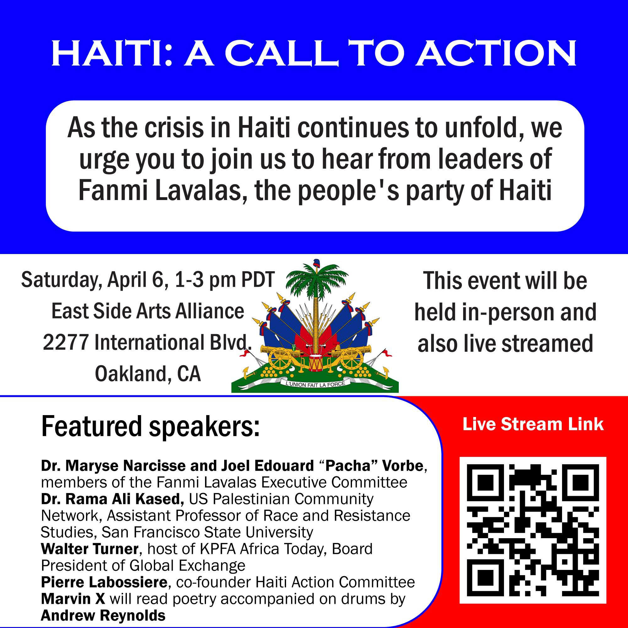 Categories Uncategorized Oakland, April 6, 2024: Haiti, A Call to Action! Post author By wibailoutpeople Post date April 2, 2024 Live-streamed on youtube. — Haiti Action Committee PO Box 2040 Berkeley,CA 94702 Website YouTube Facebook Twitter Share this: Click to share on X (Opens in new window) X Click to share on Facebook (Opens in new window) Facebook Like Loading... Related ← Menasha, May 11, 2024: PRIDEducation → Green Berets “Permanently” Stationed in Taiwan Near China’s Mainland Coast