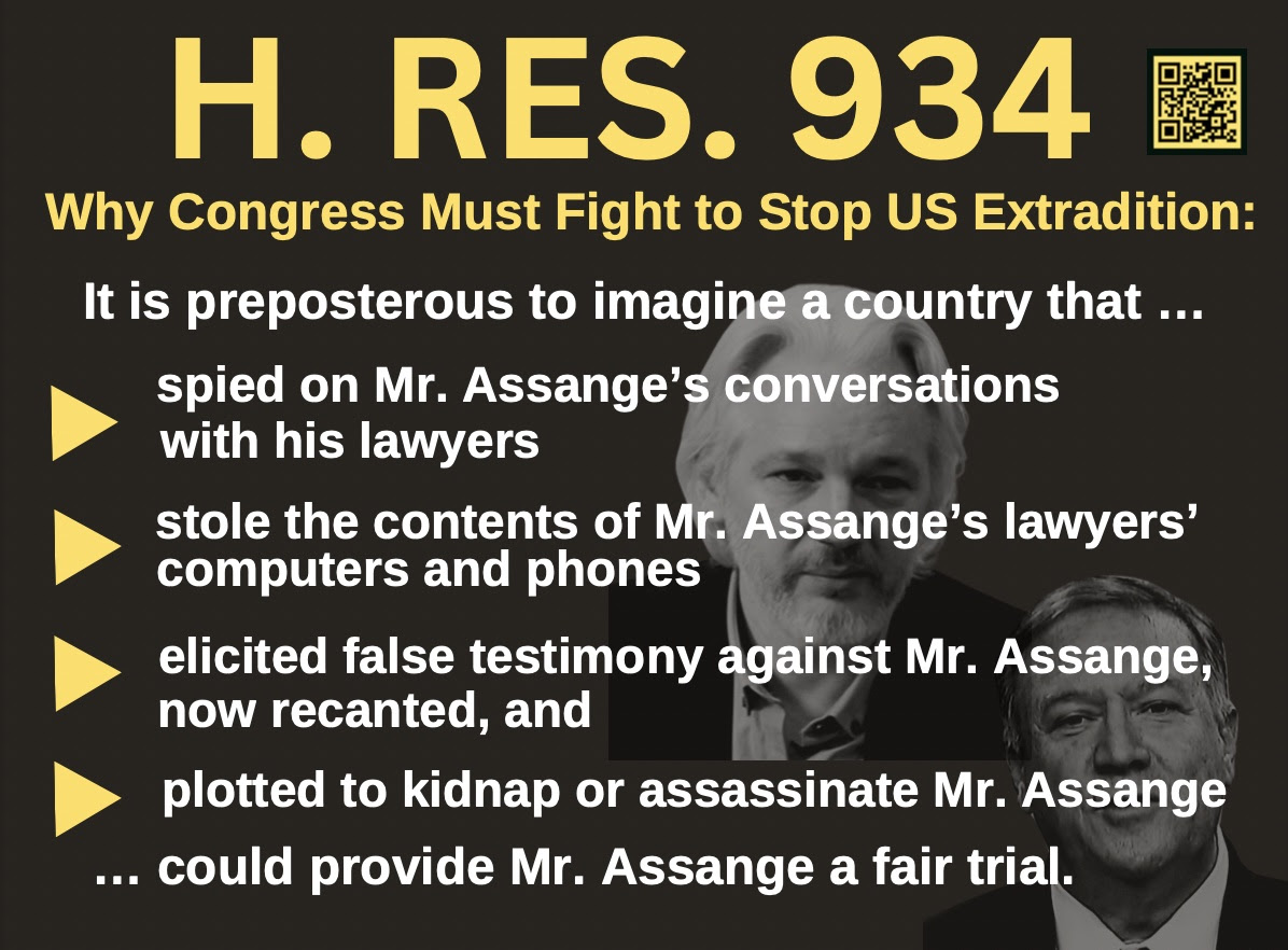 The postcards ask each representative to sign onto H. Res. 934 to free Julian Assange (or thank those who already have.)