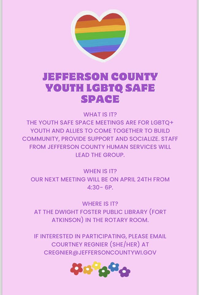 Categories Uncategorized Jefferson County Youth LGBTQ Safe Space – Next Meeting April 24, 2024 in Fort Atkinson Post author By wibailoutpeople Post date April 11, 2024 Share this: Share on X (Opens in new window) X Share on Facebook (Opens in new window) Facebook Like Loading... Related ← We Rise Fighting! Labor Podcast – E80: Interview w/ David Van Deusen. Topic: His new book titled “Insurgent Labor: The Vermont AFL-CIO 2017–2023” → Fred Goldstein’s analysis of capitalism, imperialism, and China resonates today