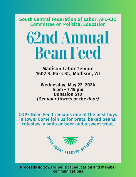 Categories Uncategorized Madison, May 22, 2024: South Central Federation of Labor’s 62nd Annual Bean Feed Post author By wibailoutpeople Post date April 11, 2024 South Central Federation of Labor Share this: Share on X (Opens in new window) X Share on Facebook (Opens in new window) Facebook Like Loading... Related ← PETITION: Calling on UW Health to Respect Nurses and Honor their Right to a Union Election → May 11, 2024: National Association of Letter Carriers – Stamp Out Hunger Drive
