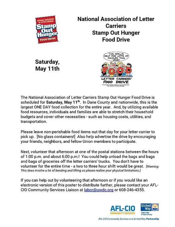 Categories Uncategorized May 11, 2024: National Association of Letter Carriers – Stamp Out Hunger Drive Post author By wibailoutpeople Post date April 11, 2024 National Association of Letter Carriers Share this: Share on X (Opens in new window) X Share on Facebook (Opens in new window) Facebook Like Loading... Related ← Madison, May 22, 2024: South Central Federation of Labor’s 62nd Annual Bean Feed → Madison, May 16, 2024: Faith Labor Breakfast