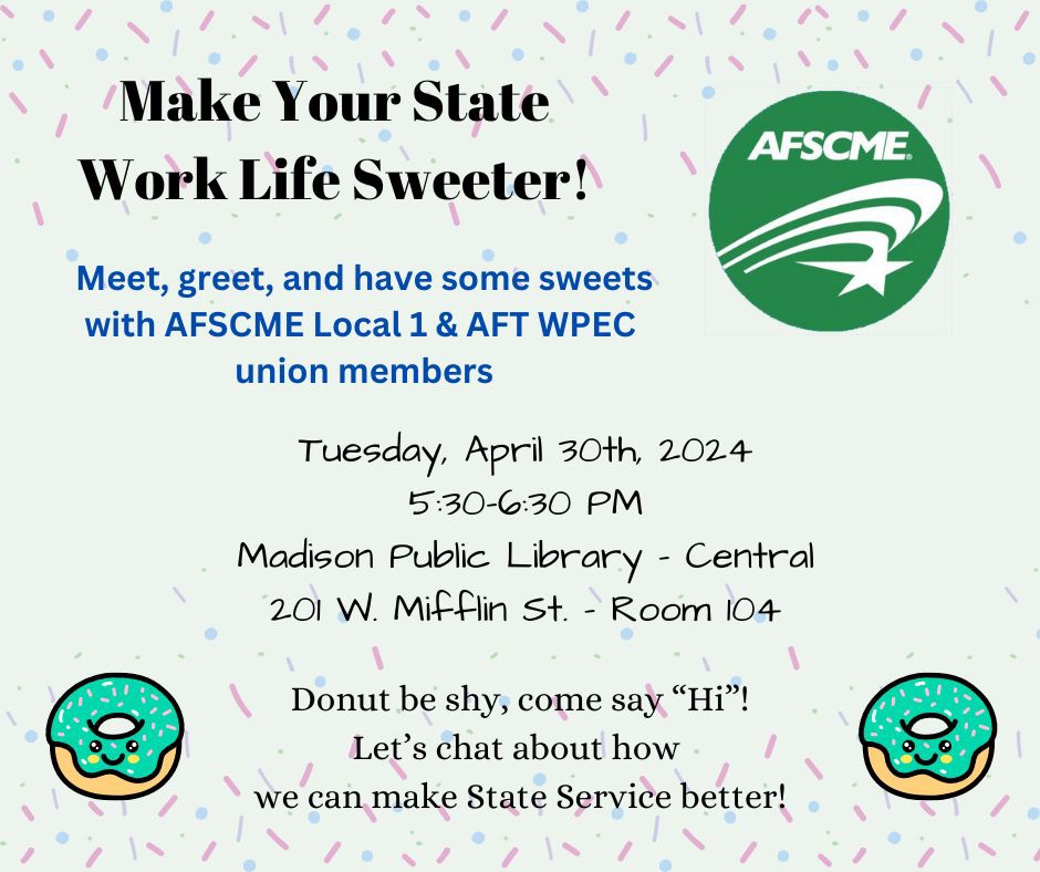 Join us in room 104 of the Central Library – meet and greet AFSCME Local 1 and AFT WPEC union members! Together, we represent a large portion of State of Wisconsin employees. We will discuss who we are, what we do, and why you should keep in touch. We’d love to hear from fellow State Employees! What do you love about your job? What would you like to see improved? – Donuts will be served. Please follow the link to let us know if you’ll attend, or connect with us if you can’t make it: https://actionnetwork.org/events/local-1-meet-and-greet/