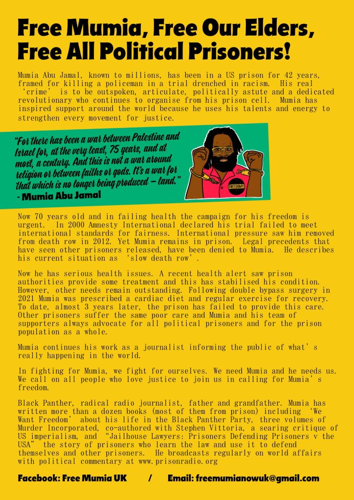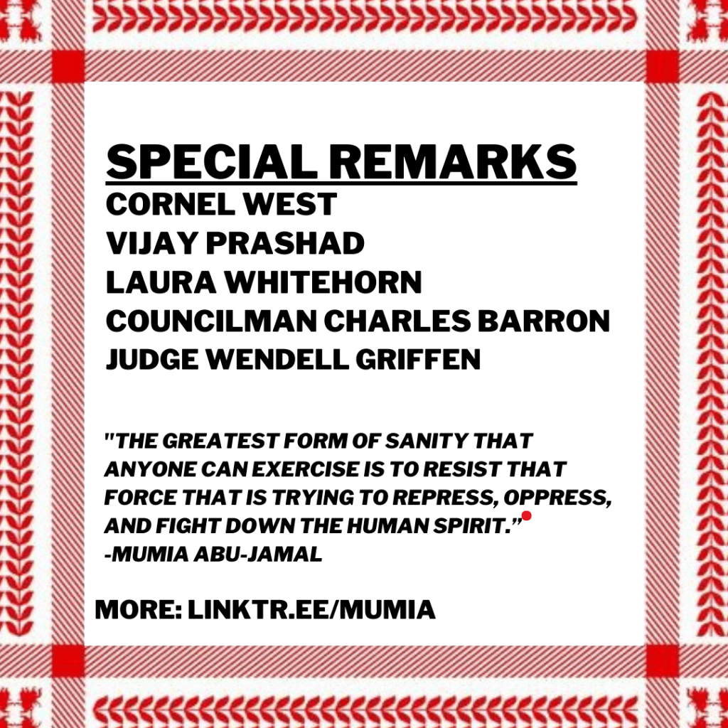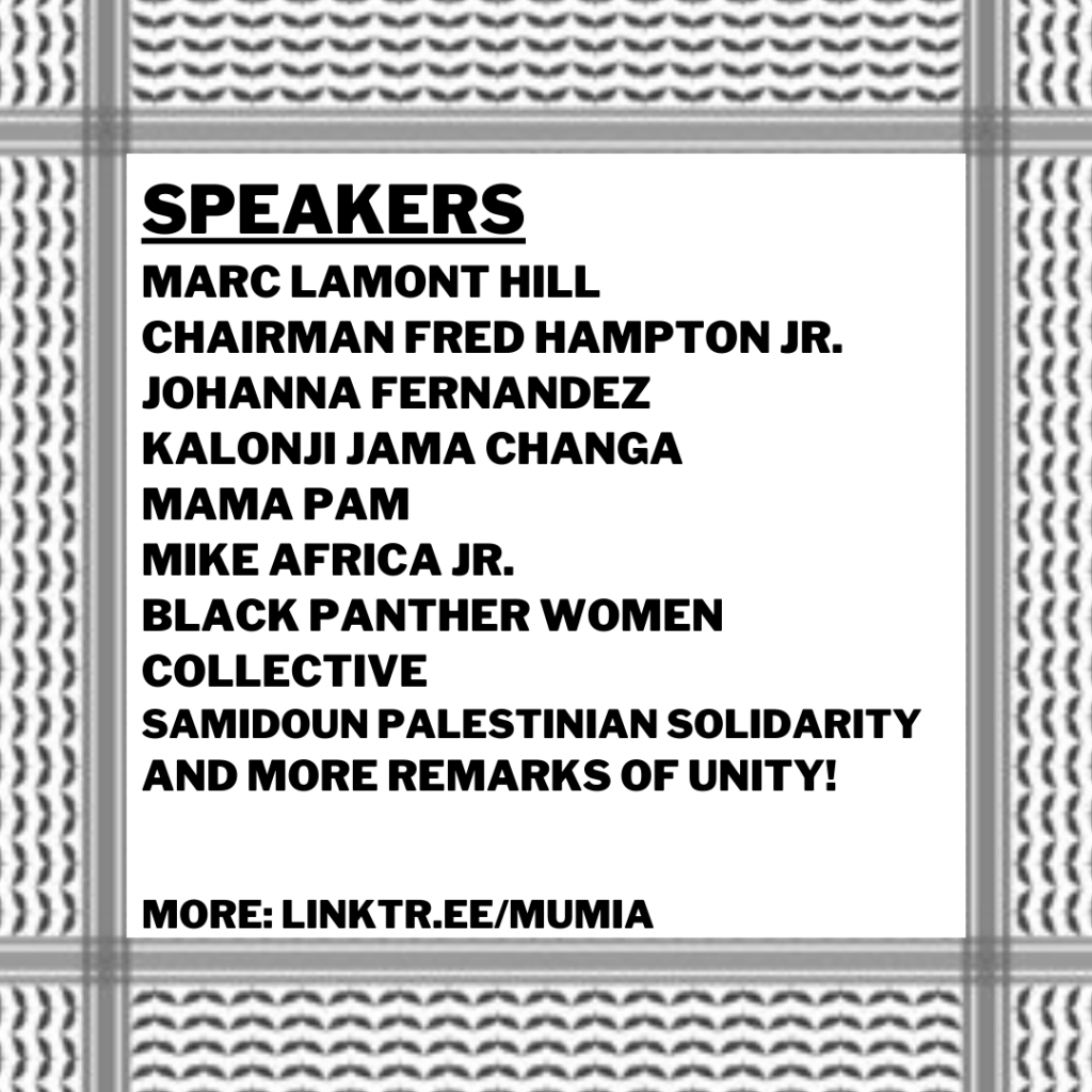 Please see flyers and info below about the April 24, 2024 afternoon and evening events in Philadelphia; details about NYC and Boston charter bus travel to and from Philly; and upcomingactions throughout the world demanding that Pennsylvania FREE Mumia Abu-Jamal. Here is a document explaining how to contact Mumia and send letters, books, money, and/or photos! Please send details if you are organizing or know of another action for Mumia. We’ll spread the word.