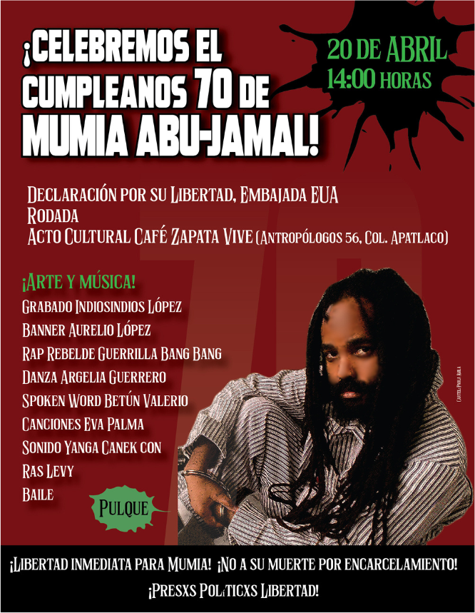 Here in Mexico City we’ll be wishing Mumia freedom on his birthday April 24th. But we’ll have our main event a few days before, on April 20th, which will be a Declaration outside the U.S. Embassy, a Bike Ride to the Café Zapata Vive, and a Cultural Event at the Café Zapata Vive with art and music. ~amigos de Mumia