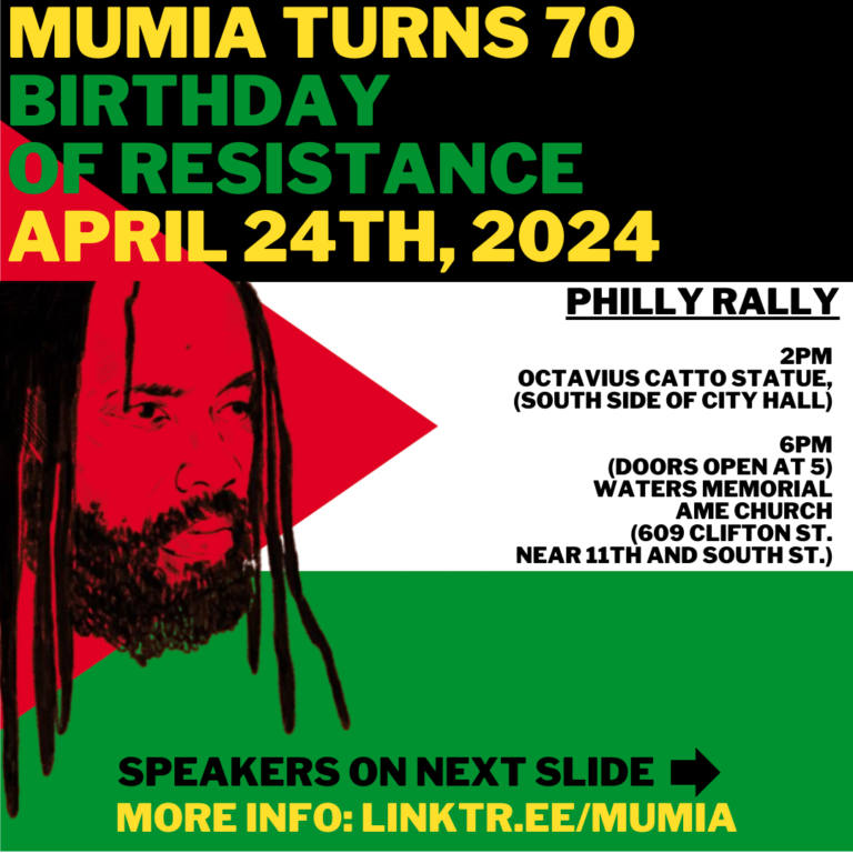 Please see flyers and info below about the April 24, 2024 afternoon and evening events in Philadelphia; details about NYC and Boston charter bus travel to and from Philly; and upcomingactions throughout the world demanding that Pennsylvania FREE Mumia Abu-Jamal. Here is a document explaining how to contact Mumia and send letters, books, money, and/or photos! Please send details if you are organizing or know of another action for Mumia. We’ll spread the word.