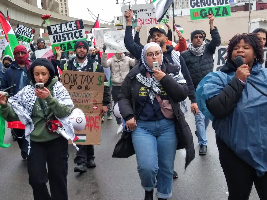 On Fri. afternoon April 12, 2024, hundreds gathered in the light rain across from the Spirit of Detroit near the riverfront to demonstrate their outrage at the continuing genocide against the Palestinians in Gaza.