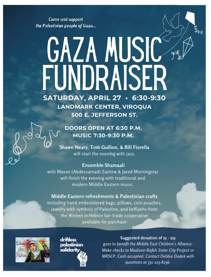 Categories Uncategorized Viroqua, April 27, 2024: Gaza Music Fundraiser Post author By wibailoutpeople Post date April 15, 2024 Madison-Rafah Sister City Project Share this: Share on X (Opens in new window) X Share on Facebook (Opens in new window) Facebook Like Loading... Related ← April 15, 2024: Coordinated Economic Blockade to Free Palestine Worldwide → Milwaukee, April 17, 2024: Palestinian Prisoner’s Day! – Shut It Down for Palestine!