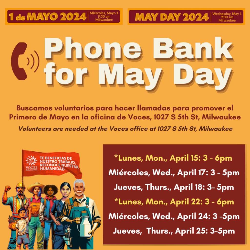 Categories Uncategorized Phone Bank for May Day in Milwaukee April 15-25, 2024 Post author By wibailoutpeople Post date April 16, 2024 Voces de la Frontera Miembros de Milwaukee, venga a hacer llamadas para el 1 de Mayo con nosotros esta semana. ¿No vive en MKE? Hay otras oportunidades tambien.——Milwaukee members, come make May Day calls with us this week! Not from MKE? Other opportunities available! Share this: Click to share on X (Opens in new window) X Click to share on Facebook (Opens in new window) Facebook Like Loading... Related ← The Area Now Known as ‘Door County:’ May 25-26-27, 2024: Creation Water Walk – We Do This for the Water! → Nicaragua Files Genocide Lawsuit Against Germany for Arming Israel
