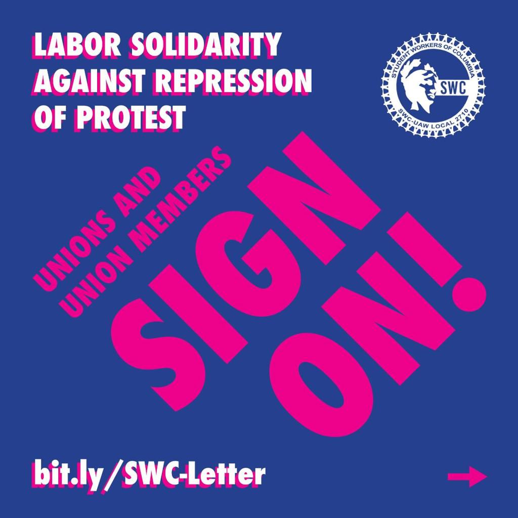 Categories Uncategorized Student Workers of Columbia – UAW Local 2710: ‘Labor Solidarity Against Repression of Protest’ Post author By wibailoutpeople Post date April 22, 2024 Student Workers of Columbia – UAW Local 2710 Share this: Share on X (Opens in new window) X Share on Facebook (Opens in new window) Facebook Like Loading... Related ← 2024 Labor Notes Conference: Featured Session – Black Labor Struggles Over Time → From Falasteen to O’odham Jeweḍ: Israeli occupation is global w/ Napoleon Marrietta