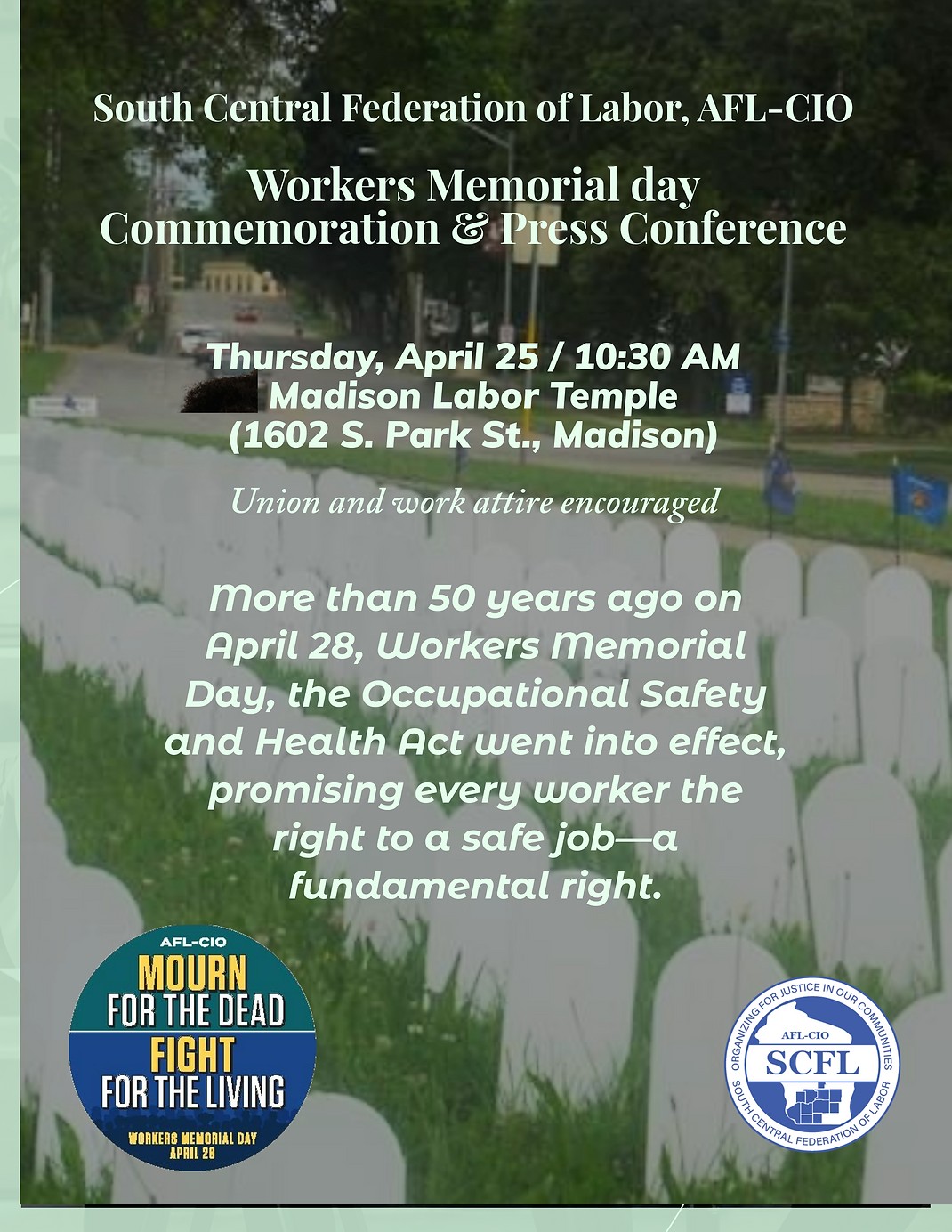 Thank you to all who volunteered and helped us set up for Workers Memorial Day. The grave markers represent the thousands of workers throughout the country that never made it home.