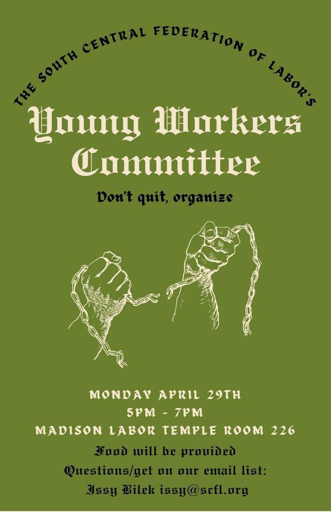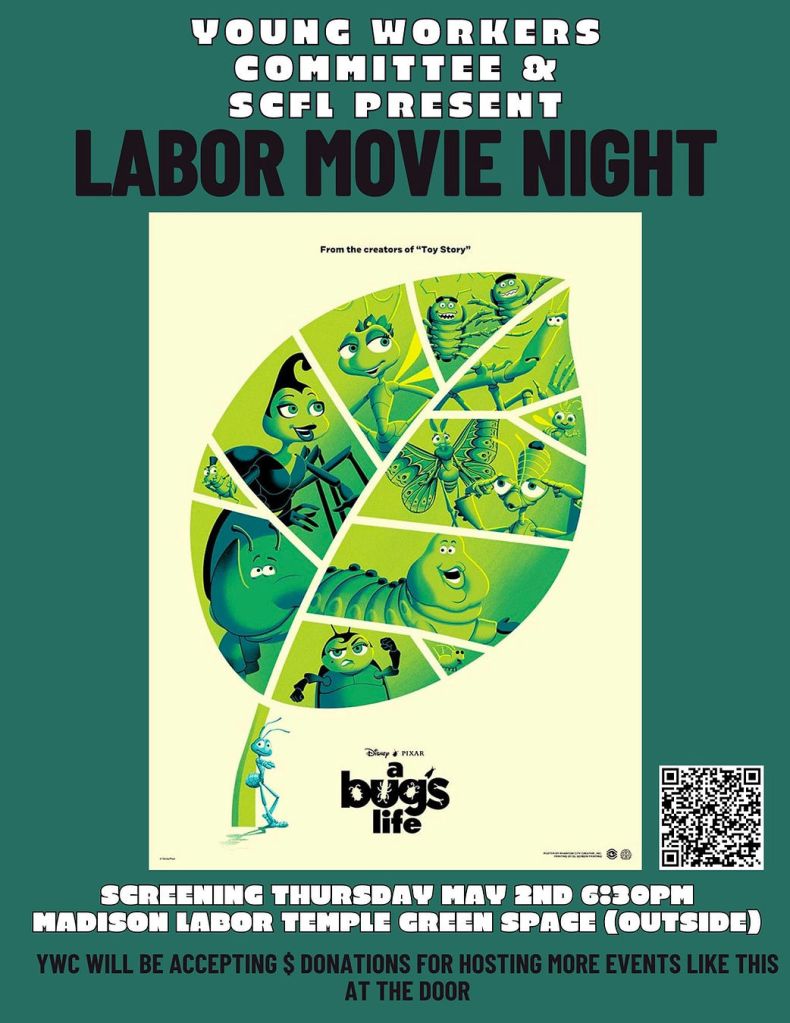 Categories Uncategorized Madison: Young Workers Committee April 29 and Labor Movie Night May 2, 2024 Post author By wibailoutpeople Post date April 23, 2024 If you are a young worker and want to organize, get active, and fight for the working class, come to our next SCFL Young Workers Committee (YWC).And ALL ARE INVITED for our next SCFL YWC Movie Night (to be held outdoors)! Popcorn provided! South Central Federation of Labor Share this: Share on X (Opens in new window) X Share on Facebook (Opens in new window) Facebook Like Loading... Related ← Madison: Solidarity With Union Educators! → Russians Advisors Arrive in Niger While the Masses Demand Withdrawal of Pentagon Troops