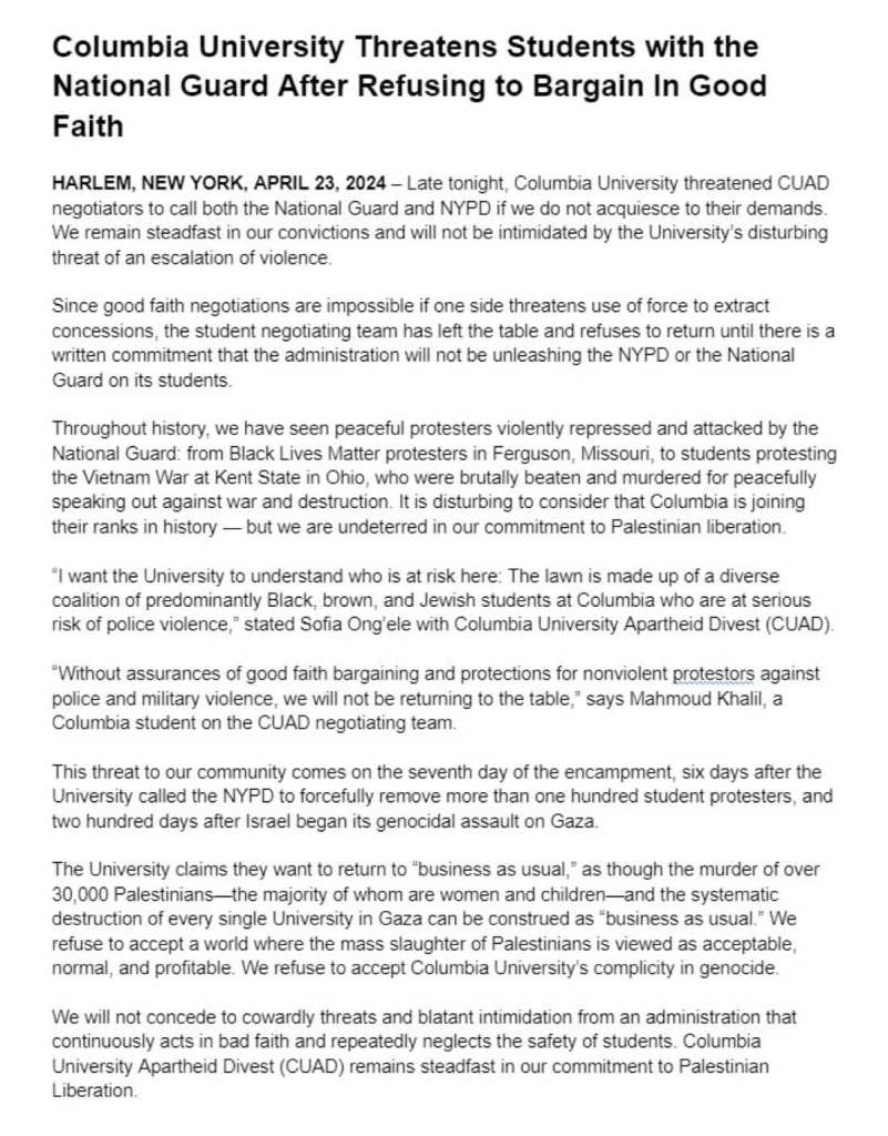 Categories Uncategorized Students for Justice in Palestine at Columbia – Statement Post author By wibailoutpeople Post date April 24, 2024 Columbia Students for Justice in Palestine Share this: Share on X (Opens in new window) X Share on Facebook (Opens in new window) Facebook Like Loading... Related ← Palestinian Casualties in Gaza Mount → Students, Staff and Faculty Build Palestine Solidarity Encampments Nationwide (List)
