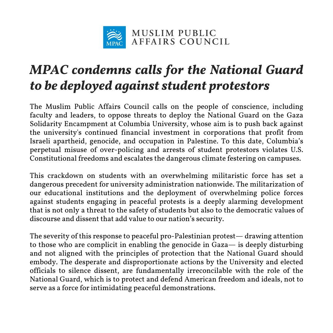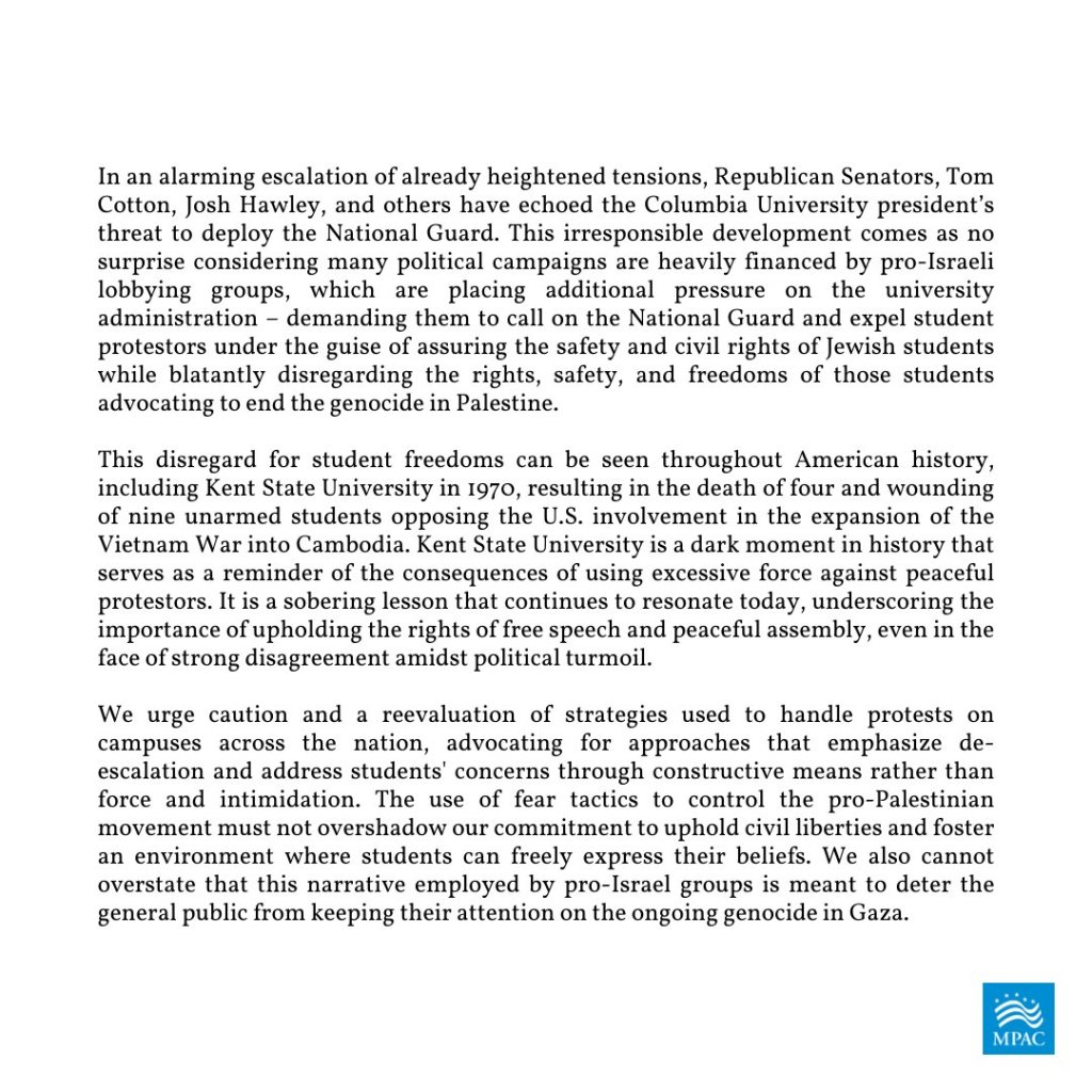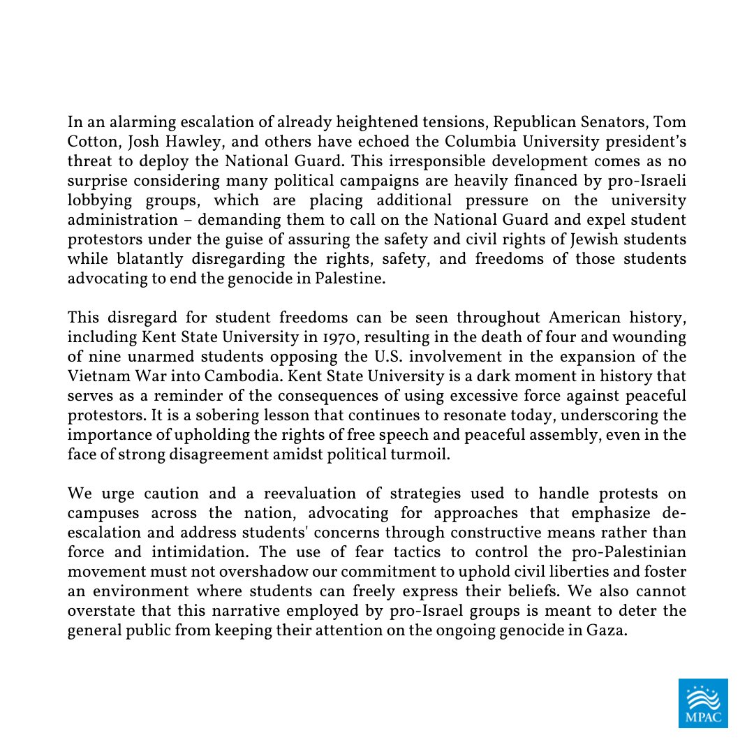 We, as the people of conscience, demand AIPAC politicians and university administration back down on their calls for the National Guard to be deployed against our students. The militaristic approach to peaceful protests against institutions complicit in genocide is a reminder of a dark moment in our history at Kent State University that resulted in the tragic death of students on campus at the hands of the federal government. We find ourselves in 2024 the very same place we were in 1970. This is a dangerous escalation during a time of heightened tension and needs to end effective immediately.