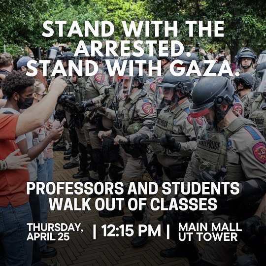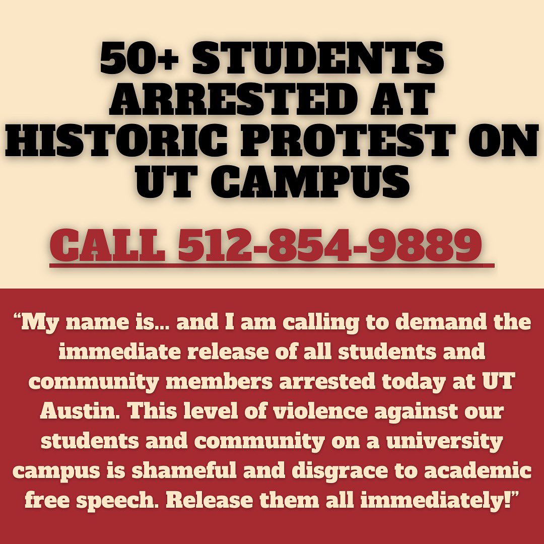 Statement from April 24, 2024: Today, the University of Texas at Austin administration and Texas Gov. Greg Abbott ordered the arrest of over 50 UT Austin students and community members by state troopers. Through this unprecedented act of repression they have made it explicitly clear: advocating against a genocide is criminal in Austin!
