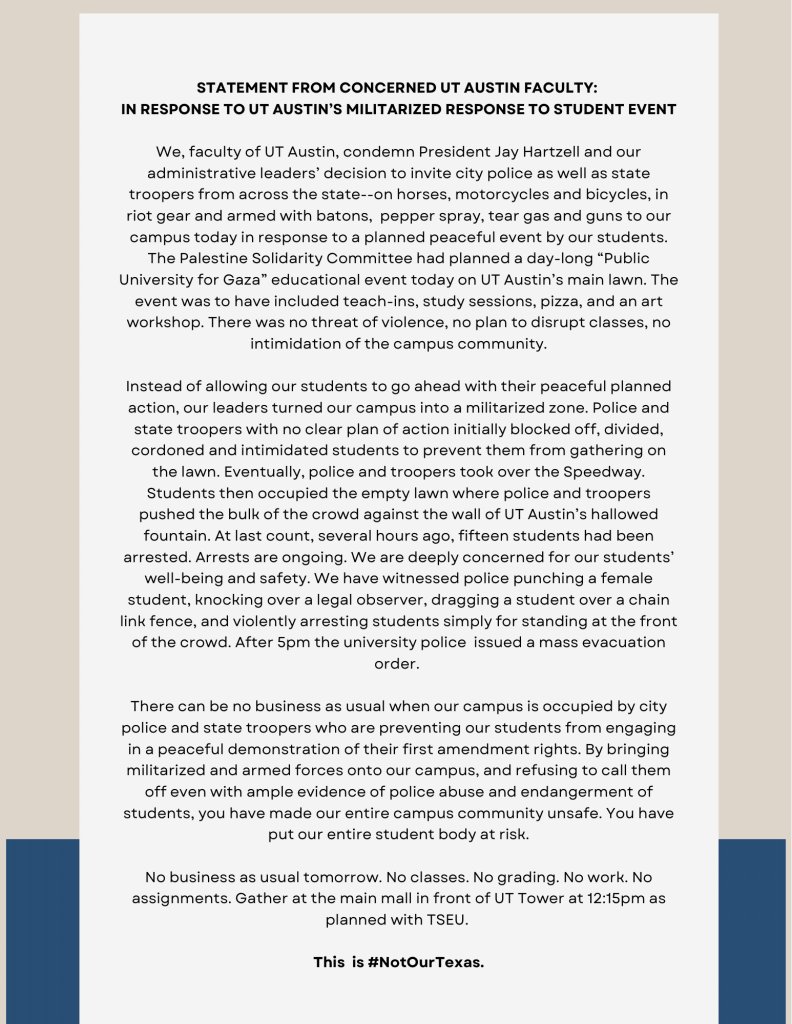 Categories Uncategorized Statement from Concerned UT Austin Faculty: In Response to UT Austin’s Militarized Response to Student Palestine Events – Faculty Strike April 26, 2024 Post author By wibailoutpeople Post date April 25, 2024 #NotOurTexas Share this: Share on X (Opens in new window) X Share on Facebook (Opens in new window) Facebook Like Loading... Related ← When Che Guevara came to Gaza → Statement from Emory University Protestors – ‘We Invite You to Struggle With Us’