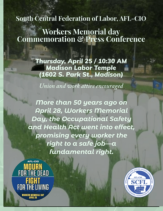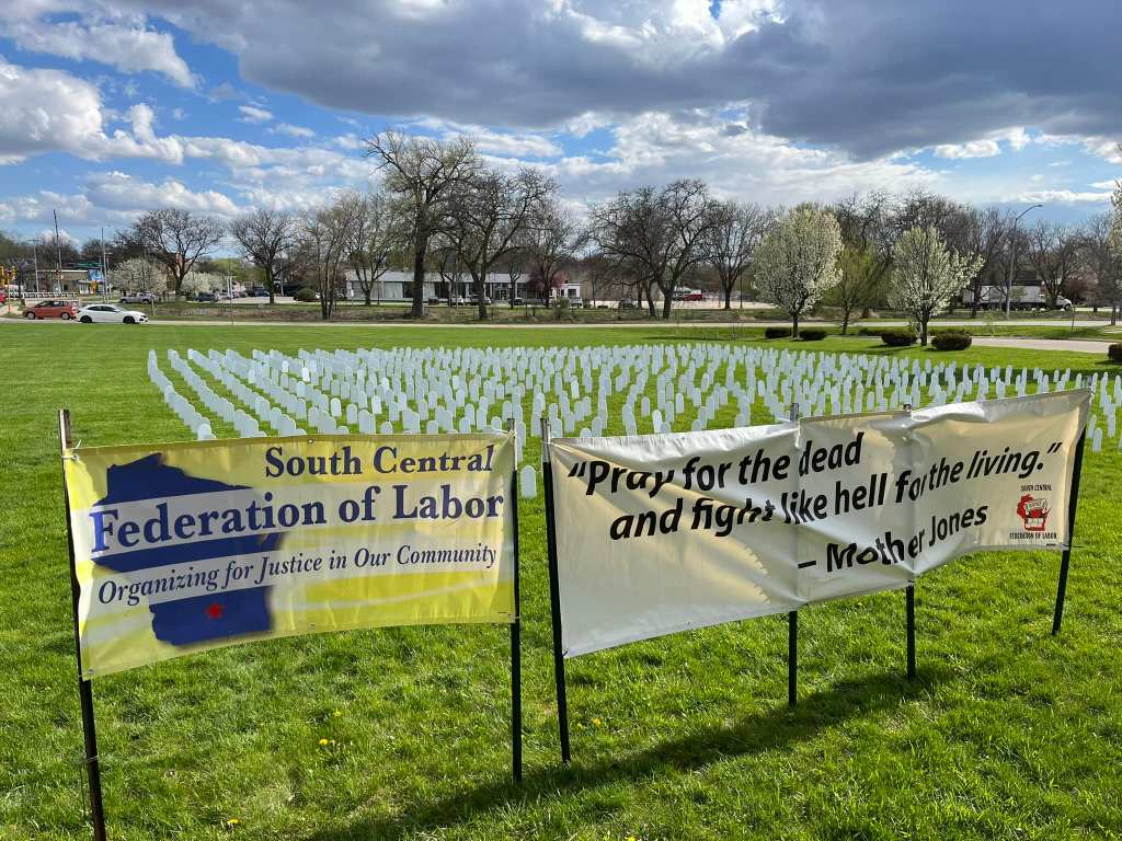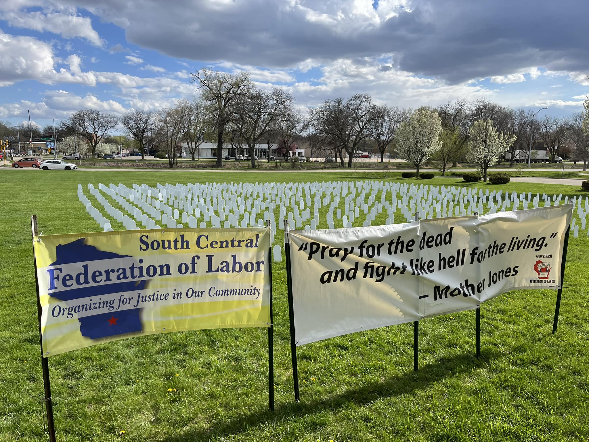 Categories Uncategorized Workers Memorial Day – We Remember Our Fellow Workers, Always Post author By wibailoutpeople Post date April 25, 2024 Memorial at the South Central Federation of Labor, Madison, WI (April 2024. / Photo: We Rise Fighting – Labor Podcast Share this: Share on X (Opens in new window) X Share on Facebook (Opens in new window) Facebook Like Loading... Related ← Starbucks Union Workers Begin Bargaining – Ways to Support → Madison, April 30, 2024: Meet & Greet with State Workers (AFSCME, AFT)