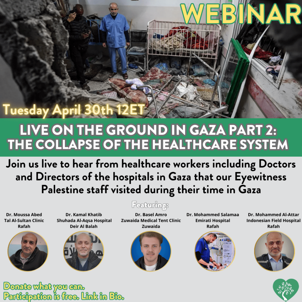 Categories Uncategorized Eyewitness Palestine Presents: Webinar on Collapse of the Gaza Health Care System Post author By wibailoutpeople Post date April 26, 2024 More information and registration here. (Free but donations accepted) Share this: Share on X (Opens in new window) X Share on Facebook (Opens in new window) Facebook Like Loading... Related ← Wisconsin: May Day 2024 Events in Madison and Milwaukee → Madison, May 1, 2024: Pizza & Music for Gaza (and NEW Cake Sale!) – May Day Pizza & Benefit for Gaza