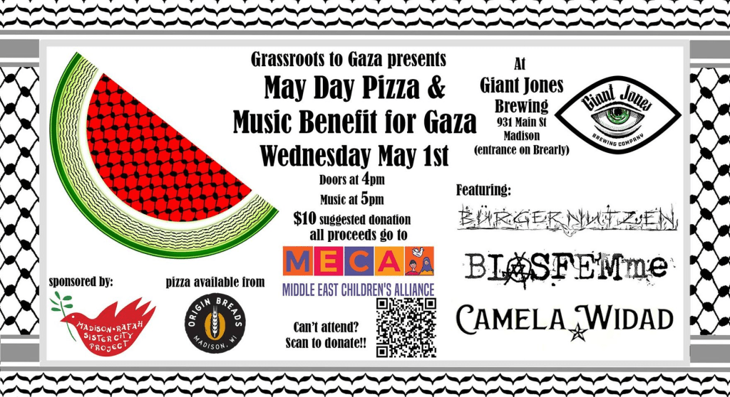 Come and enjoy the music…you can also order yourself a pizza from Origin Breads next door. Proceeds from the door go to the Middle East Children’s Alliance (MECA). A Cake Sale has been added to help evacuate a family from Rafah.