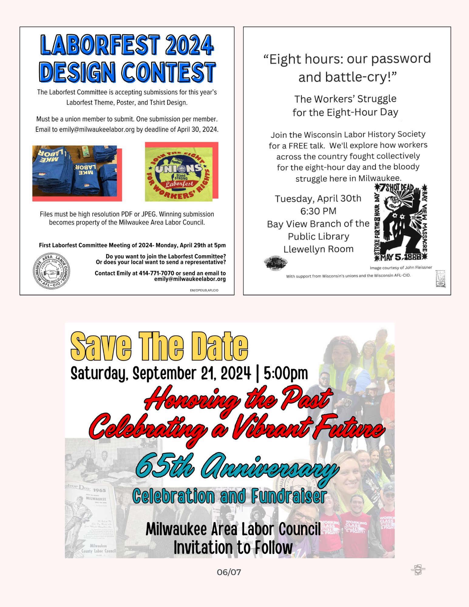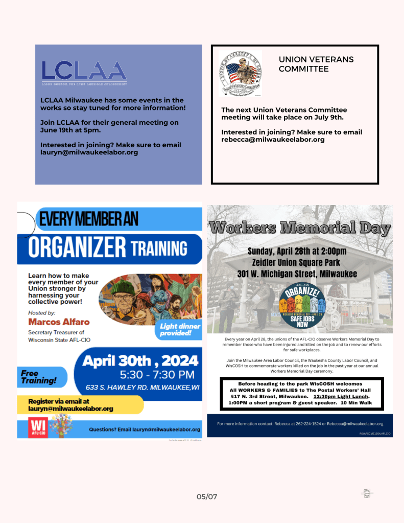 Categories Uncategorized Milwaukee, April 30, 2024: Every Member an Organizer Training Featuring Marcos Alfaro Jr., Secretary-Treasurer of the WI AFL-CIO Post author By wibailoutpeople Post date April 26, 2024 Share this: Share on X (Opens in new window) X Share on Facebook (Opens in new window) Facebook Like Loading... Related ← Wisconsin Labor History Society April 2024 Newsletter → CN WORKER KILLED ON THE JOB
