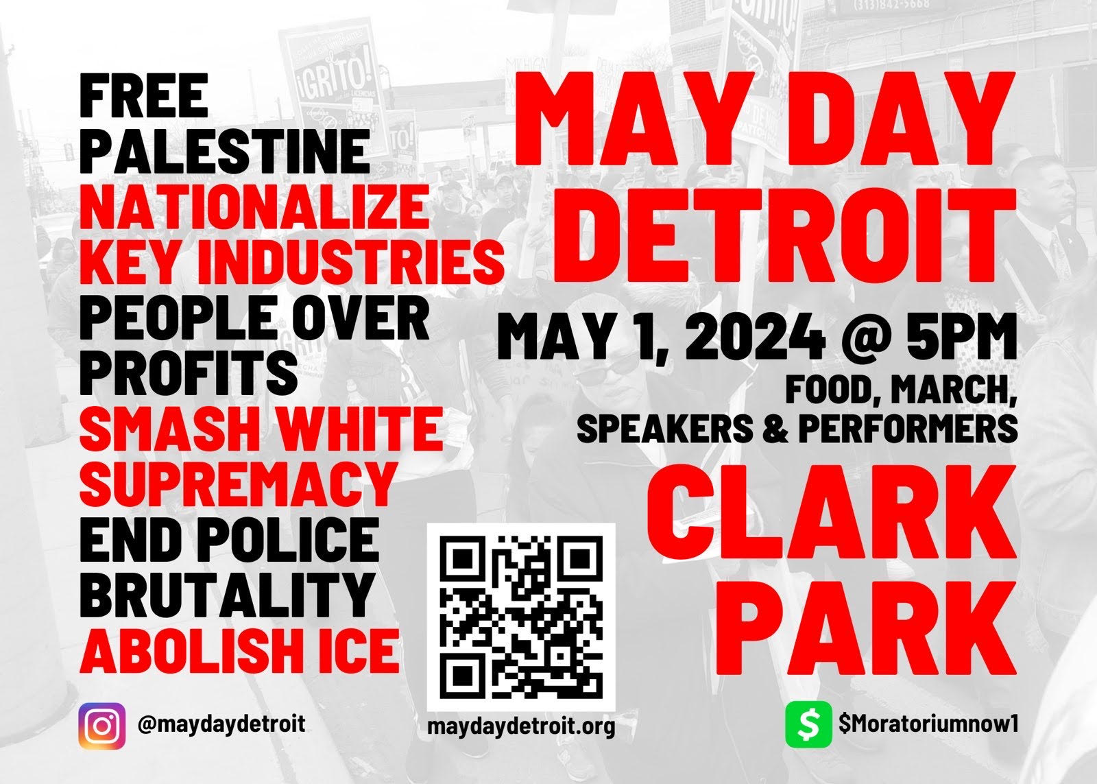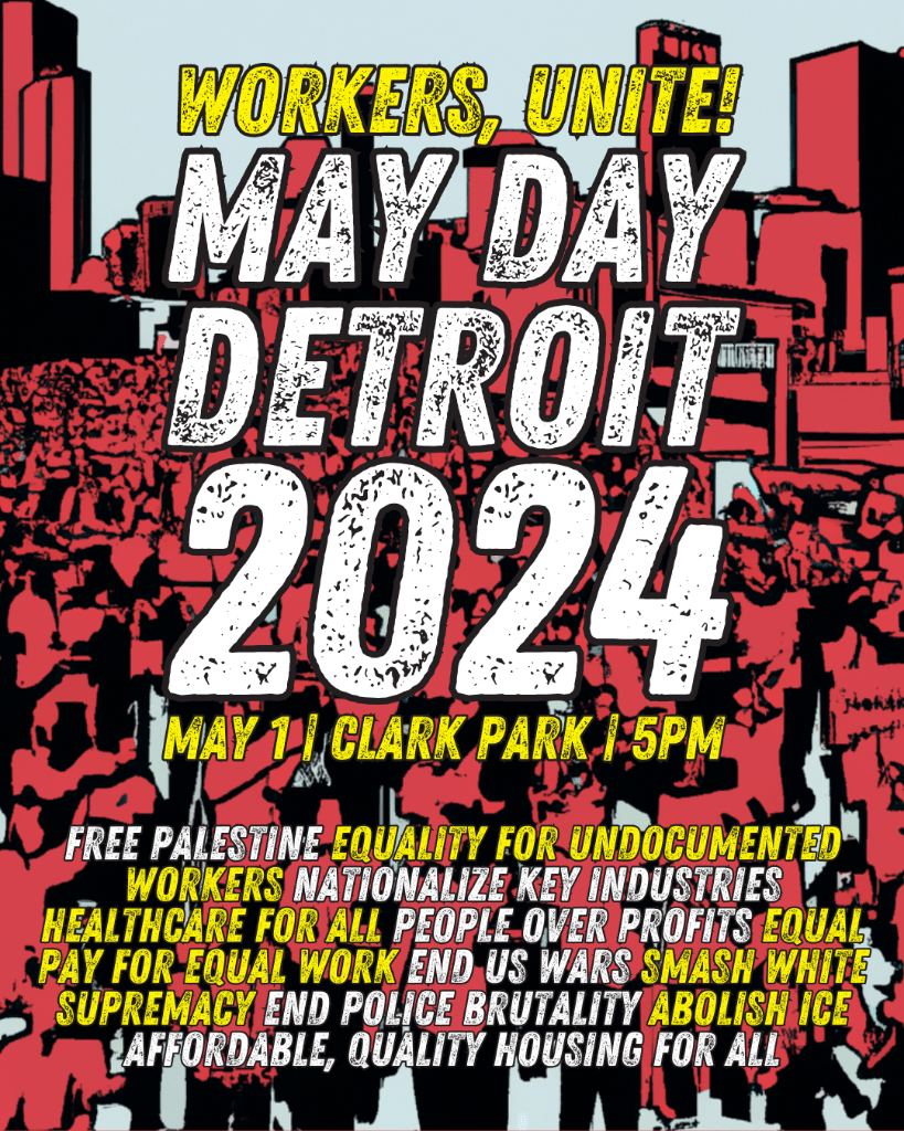 Categories Uncategorized May Day Detroit 2024 Post author By wibailoutpeople Post date April 28, 2024 Share this: Share on X (Opens in new window) X Share on Facebook (Opens in new window) Facebook Like Loading... Related ← Railroad Workers Memorial Day April 28, 2024 → UW Madison Student & Worker Palestine Encampment Begins (4/29/24)