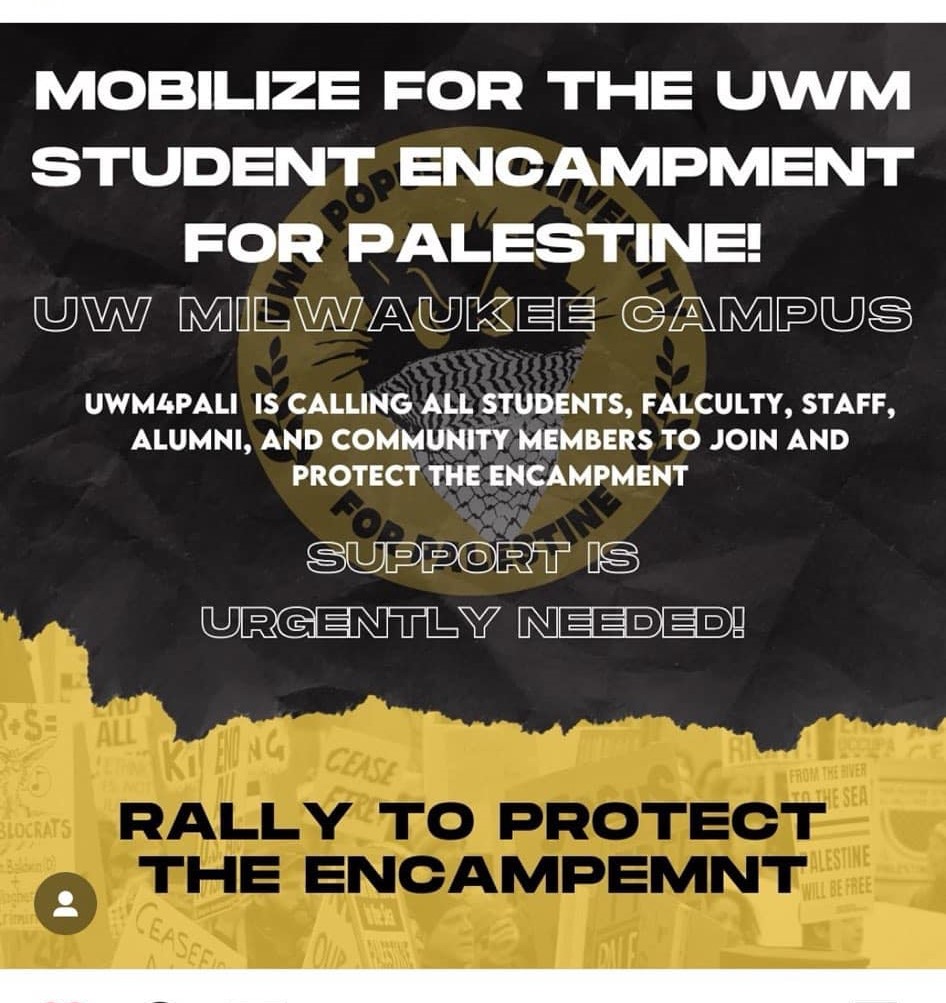 As of this morning, students at UWM have begun an encampment in solidarity with Palestine. Student organizers have announced that mass arrests are expected to begin this afternoon. UWM4PALI is calling all students, faculty, staff, alumni, and community members to join and protect the encampment. We know our power is in numbers, and we urge you to mobilize to the UWM student encampment as soon as possible. WE PROTECT US!
