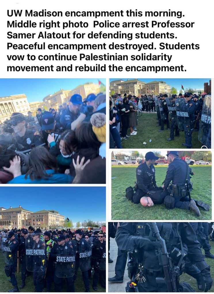 The State Patrol, UW Campus Police, Madison Police and Dane County Sheriffs were all called in this morning at 7 am, apparently by the University Administration, to destroy the student encampment protesting the Gaza war and demanding that the UW disclose and divest from its investments benefiting Israel. At least a dozen people were reportedly arrested and/or cited, others injured. As of now, the encampment at UW-Milwaukee is still standing.