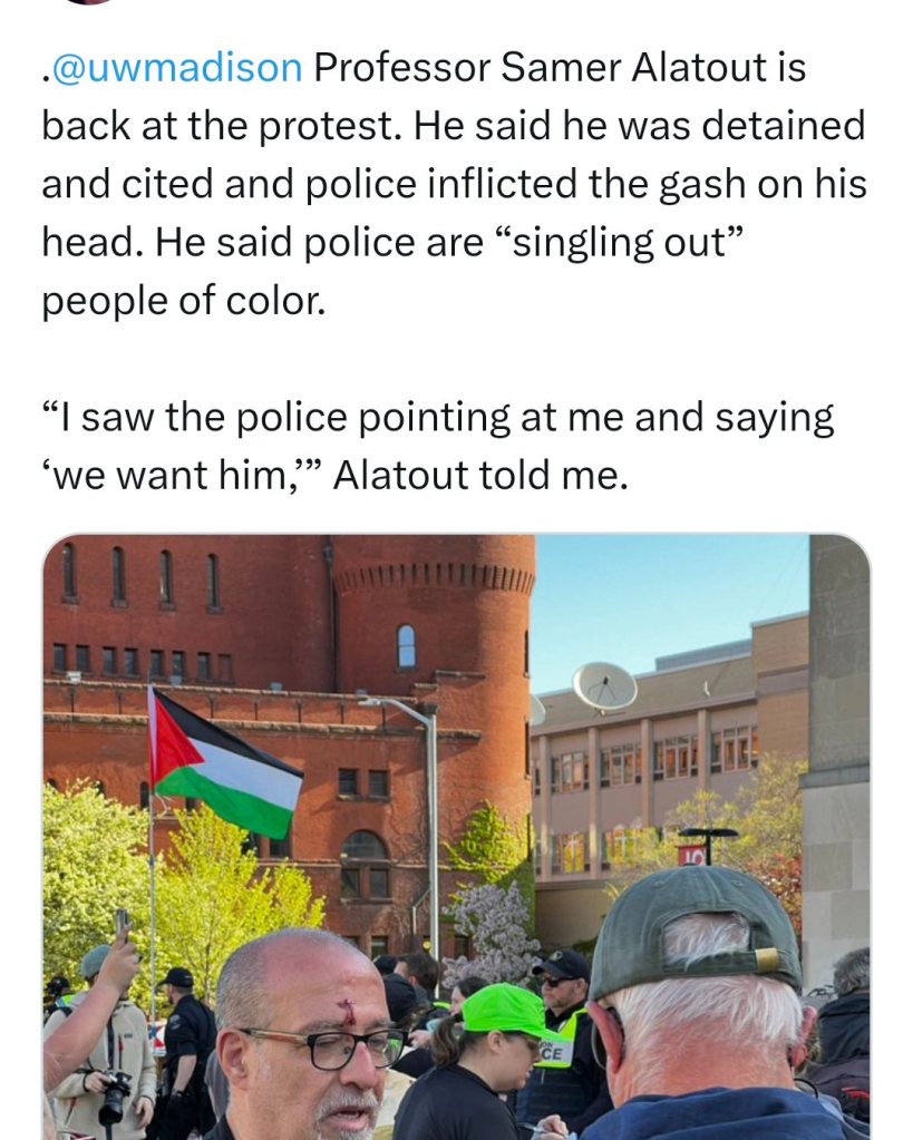Categories Uncategorized UW Madison: Professor Samer Alatout Brutalized, Detained and Cited by Police – “‘I saw the police pointing at me and saying we want him'” Post author By wibailoutpeople Post date May 1, 2024 Share this: Click to share on X (Opens in new window) X Click to share on Facebook (Opens in new window) Facebook Like Loading... Related ← UW Milwaukee Free Palestine! Encampment May Day Schedule → Milwaukee, Emergency March & Caravan May 2, 2024 – For Students Fighting for Palestine!