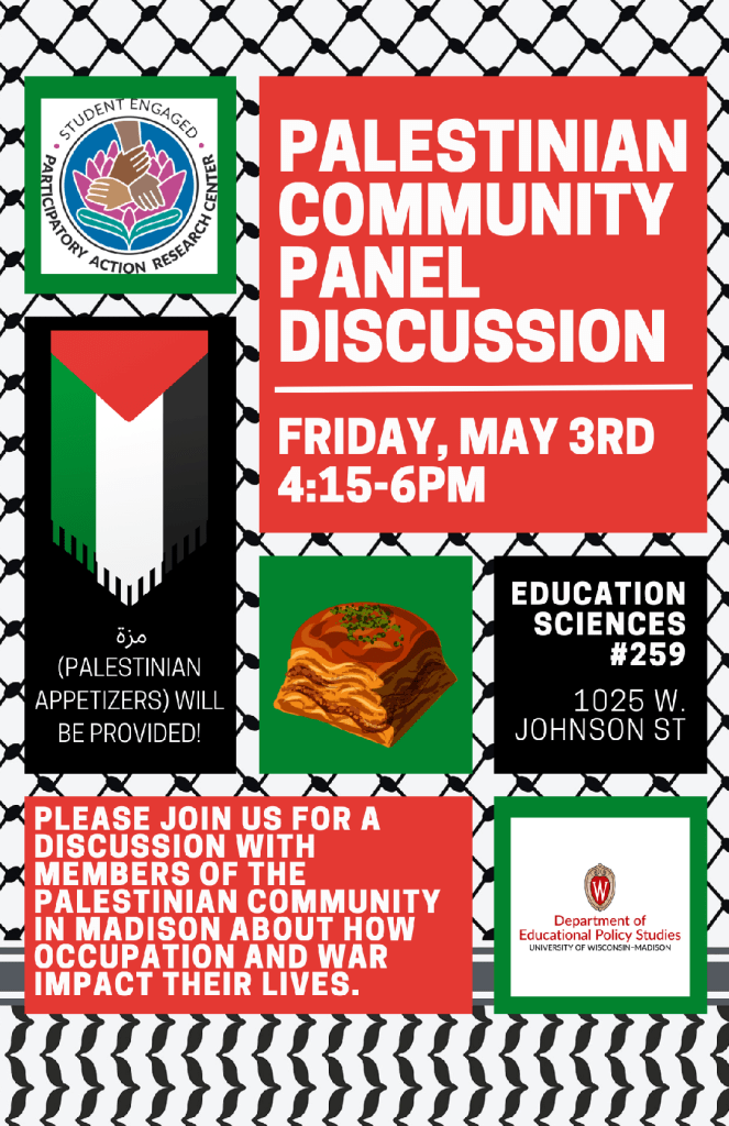 Categories Uncategorized UW Madison, May 3, 2024: Palestinian Community Panel Discussion Post author By wibailoutpeople Post date May 1, 2024 Share this: Share on X (Opens in new window) X Share on Facebook (Opens in new window) Facebook Like Loading... Related ← May 1, 2024: Rally at 5 P.M. at Library Mall at UW Madison – Join in Defending Students and Workers Against Police Repression! – Drop All Bogus Charges! – Free Palestine! → May Day 2024: Resist the witch-hunts!