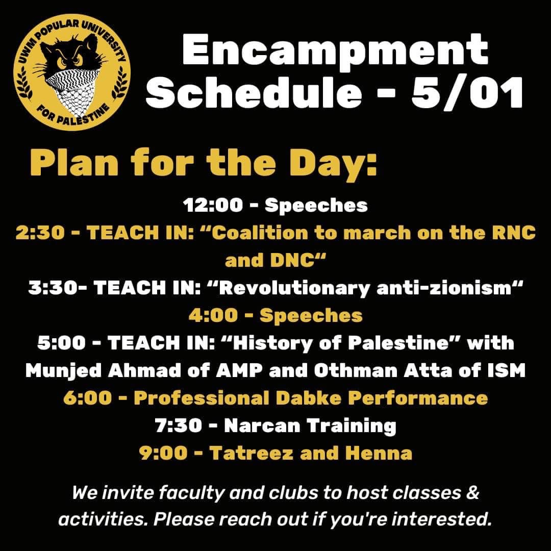 Categories Uncategorized UW Milwaukee Free Palestine! Encampment May Day Schedule Post author By wibailoutpeople Post date May 1, 2024 Share this: Click to share on X (Opens in new window) X Click to share on Facebook (Opens in new window) Facebook Like Loading... Related ← Call UW Madison Administrators Now! – Demand All Bogus Charges Against Freedom Fighters for Palestine be Dropped Right Now! → UW Madison: Professor Samer Alatout Brutalized, Detained and Cited by Police – “‘I saw the police pointing at me and saying we want him'”