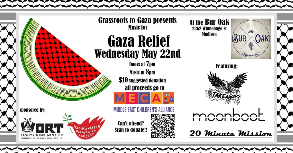Wednesday, May 15: Nakba Day Banners Up for Palestine at Trader Joe’s PlazaWednesday, May 22: Grassroots to Gaza Music Benefit at The Bur Oak