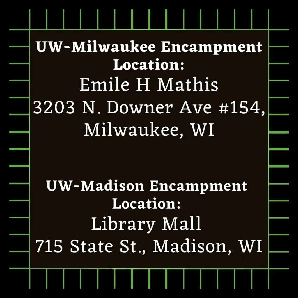 Categories Uncategorized UW Madison and UW Milwaukee Free Palestine! Encampment Locations Post author By wibailoutpeople Post date May 10, 2024 @msauwmsjpuwmadisonand wisc_ydsaWisconsin Coalition for Justice in Palestine@uwm4palicoalition Share this: Share on X (Opens in new window) X Share on Facebook (Opens in new window) Facebook Like Loading... Related ← All Eyes On Rafah → The Coors Boycott and the Birth of the LGBTQ Movement, 1934-1997 – Online May 11 and 12, 2024