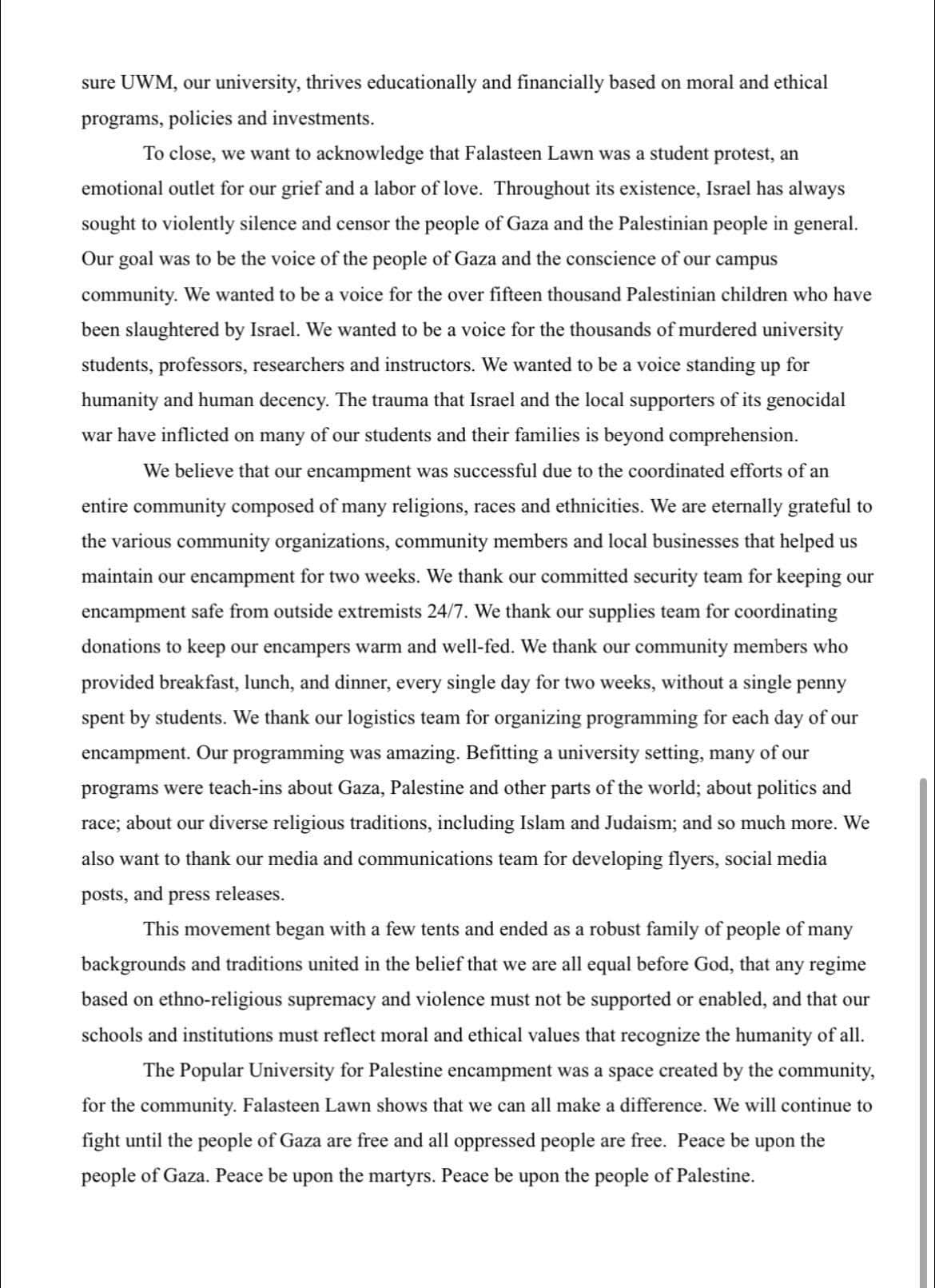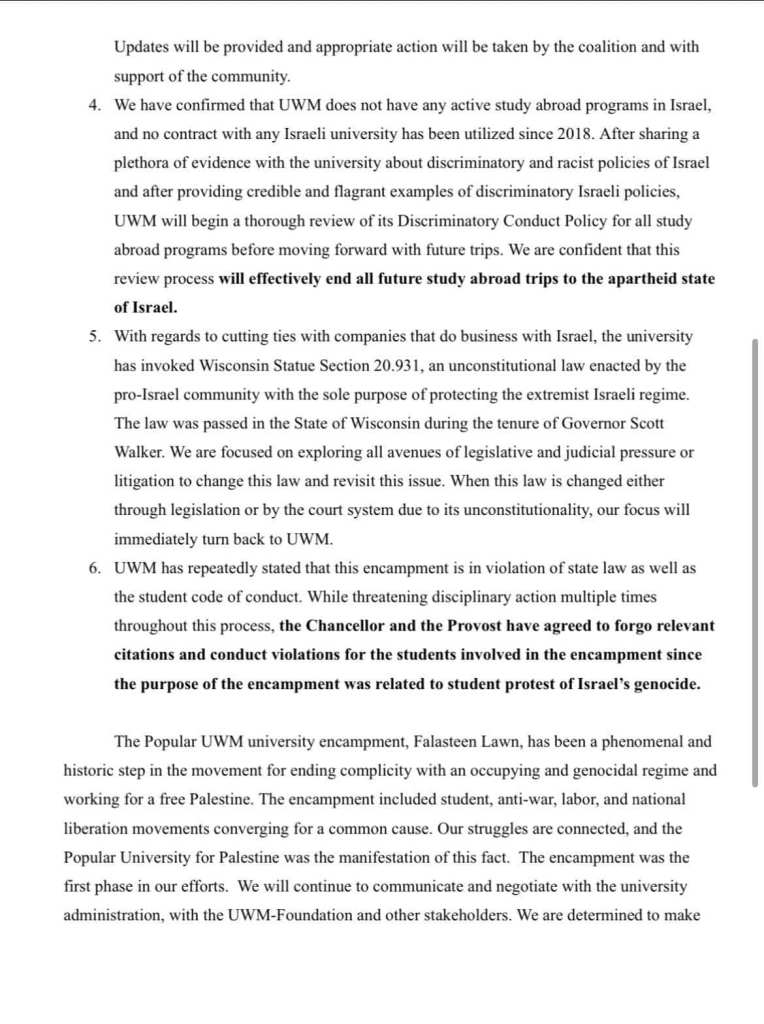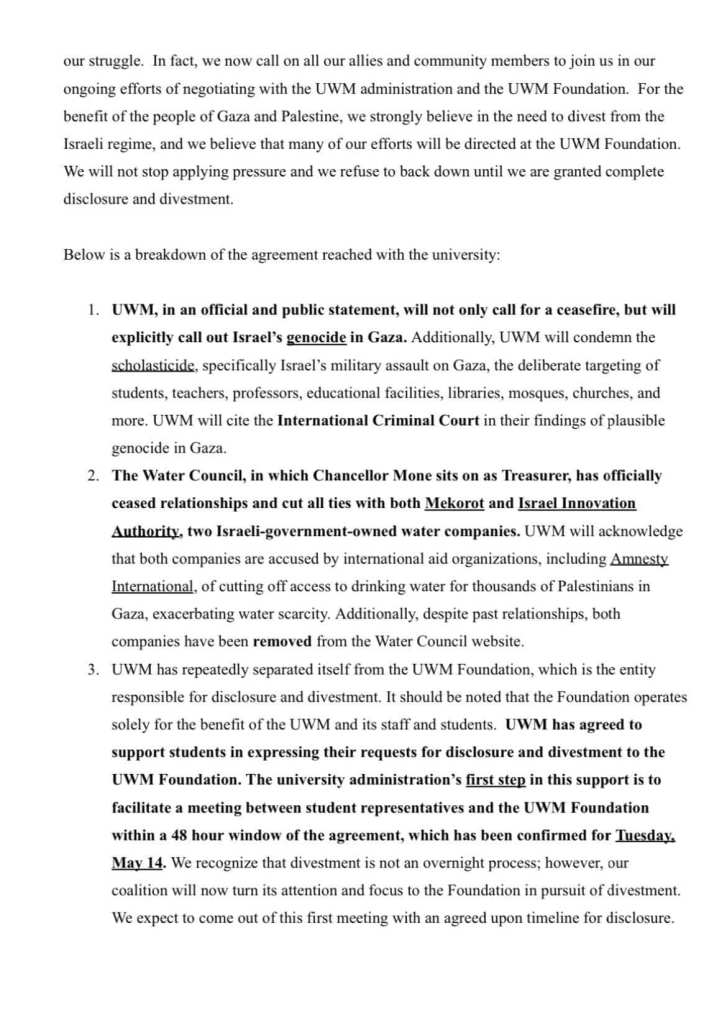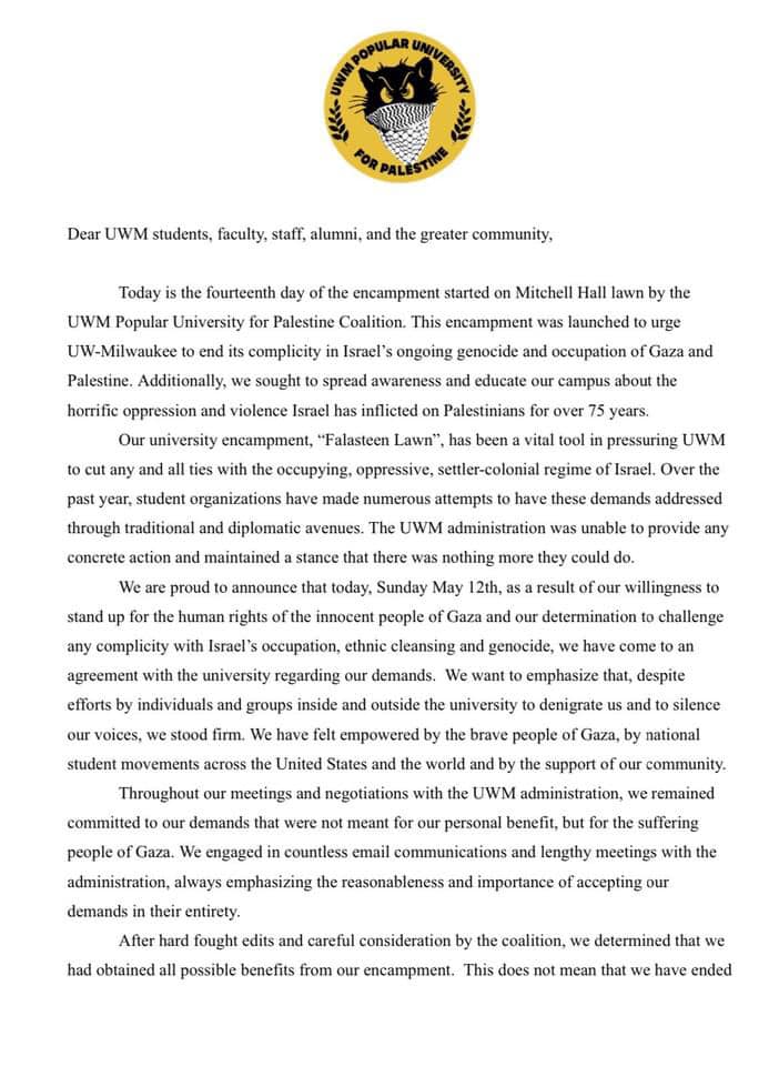 Categories Uncategorized UW-Milwaukee Popular University for Palestine Statement on Encampment Ending; The Struggle Continues! Post author By wibailoutpeople Post date May 15, 2024 Share this: Click to share on X (Opens in new window) X Click to share on Facebook (Opens in new window) Facebook Like Loading... Related ← Milwaukee, May 15, 2024: Nakba Day March → South African Freedom Day 30 Years After