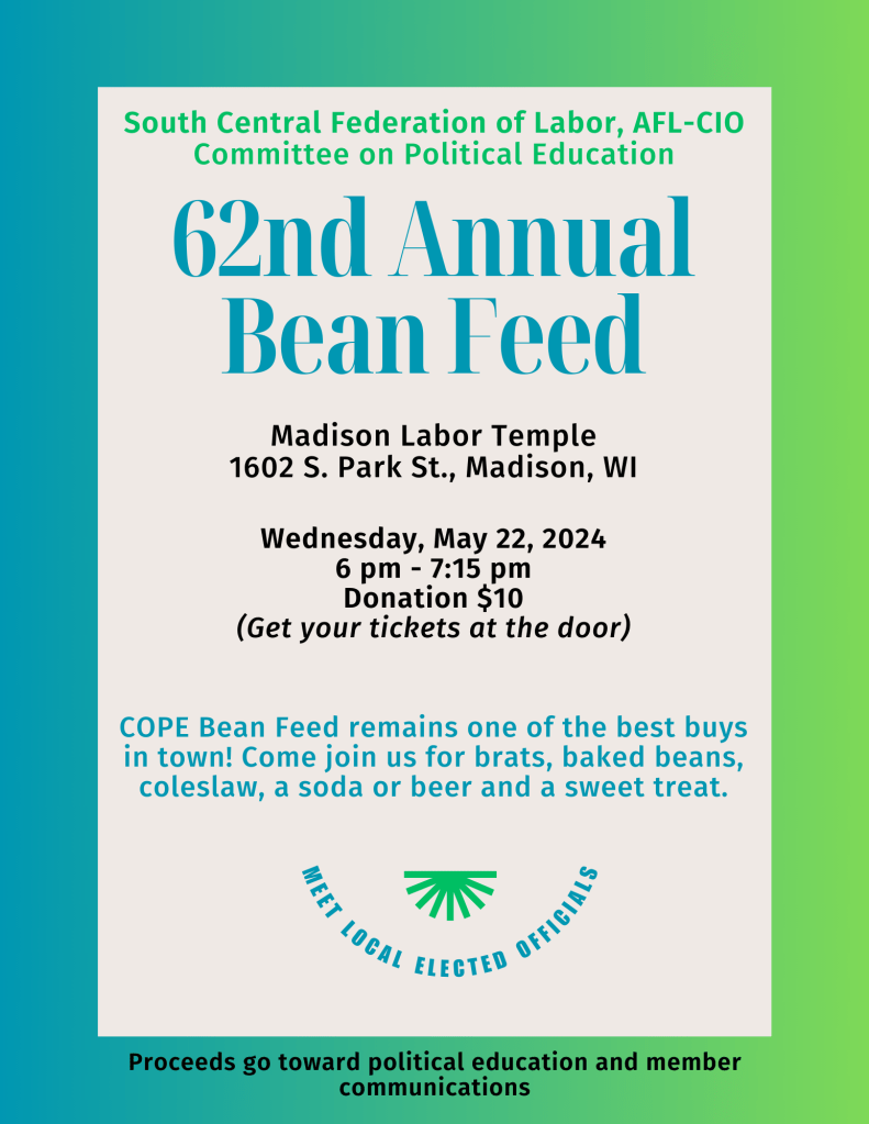 On Wednesday evening, May 22nd, starting at 6 p.m., the South Central Federation of Labor (SCFL) will host its 62nd Annual Bean Feed.