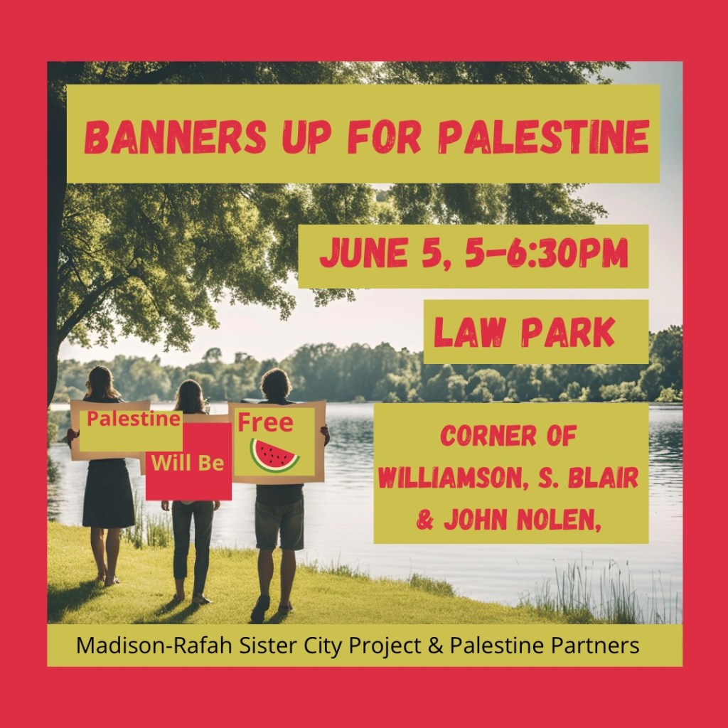 Categories Uncategorized Madison, June 5, 2024: Banners Up for Palestine! Post author By wibailoutpeople Post date May 26, 2024 Event: https://fb.me/e/3K9bSvqlw Event by Madison-Rafah Sister City Project and Palestine Partners Share this: Click to share on X (Opens in new window) X Click to share on Facebook (Opens in new window) Facebook Like Loading... Related ← The Palestinian Youth Movement’s campaign to Cut Ties with Genocide is a fight against Maersk → U.S.-Israel Continue Rafah Massacre, Targets Camps for Displaced Palestinians