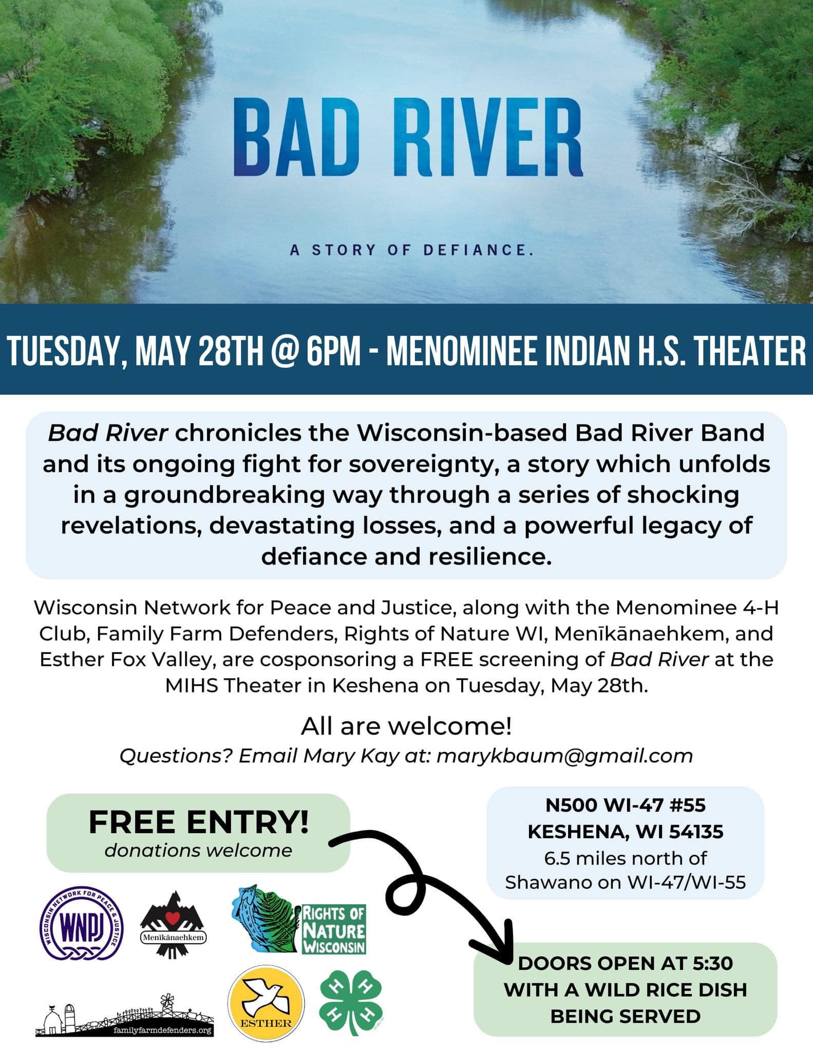 | Screening of the documentary BAD RIVER – ….a story of defiance…. Tuesday, May 28 in Keshena |
