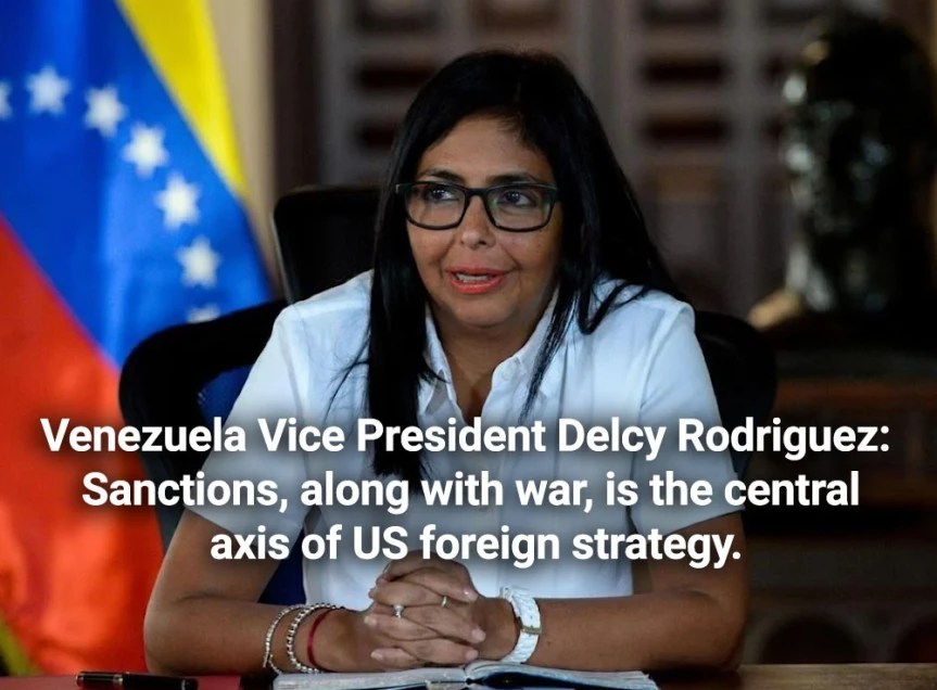 Al Mayadeen: Venezuela VP Delcy Rodriguez says sanctions and war are the center of US foreign policyShe stated sanctions, “along with war,” is the “central axis” of the United States’ foreign strategy. Delcy Rodriguez said that the US’ unilateral coercive steps are intended to compel Venezuela into changing its path of self-determination and autonomy, and that the sanctions constitute new neocolonial tactics.