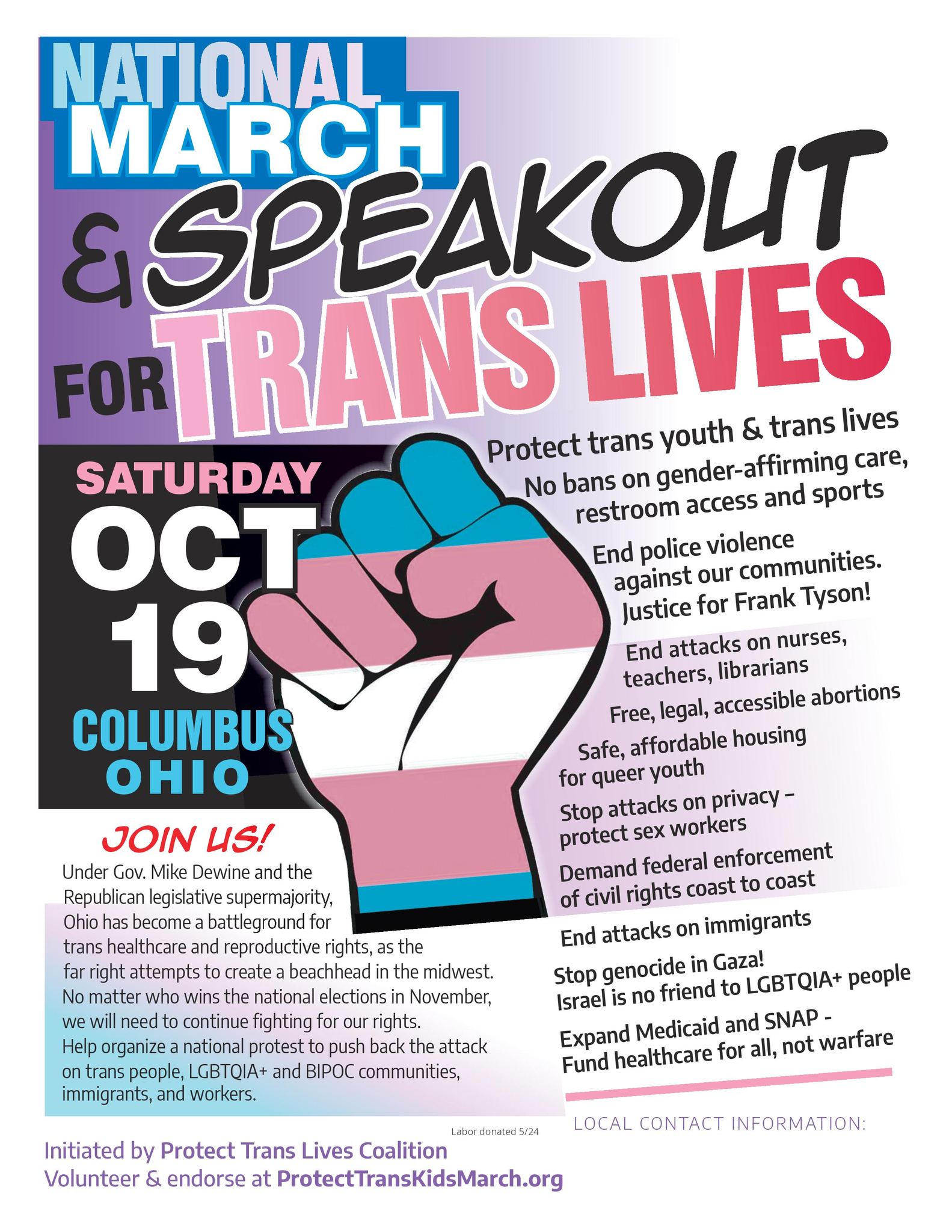 Categories Uncategorized Columbus, OH, October 19, 2024: National March & Speak-Out for Trans Lives! Post author By wibailoutpeople Post date June 2, 2024 Home Share this: Share on X (Opens in new window) X Share on Facebook (Opens in new window) Facebook Like Loading... Related ← Registration for the Cancel RIMPAC conference and mobilization June 29 and 30, 2024 in San Diego is out! → Ngugi wa Thiong’o: “An Open Letter to William Ruto,”