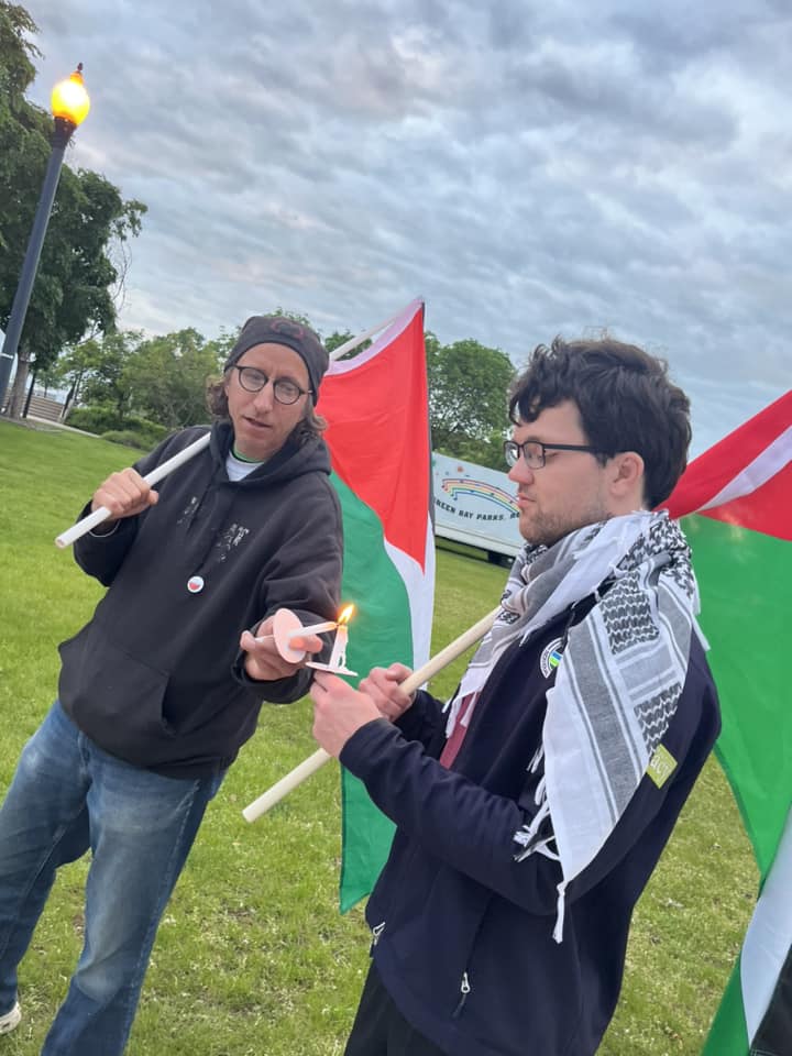 Categories Uncategorized Green Bay June 1, 2024: Vigil for Palestine! – Stop U.S.-Israel Genocide! Post author By wibailoutpeople Post date June 2, 2024 Leicht Park, Green Bay June 1, 2024. / Photos: Wisconsin Bail Out The People Movement Share this: Click to share on X (Opens in new window) X Click to share on Facebook (Opens in new window) Facebook Like Loading... Related ← Milwaukee, June 2, 2024: We Are the Red Line – Stop the U.S.-Israel Genocide! → PFLP: Biden is partner in war crimes against our people, not to be trusted