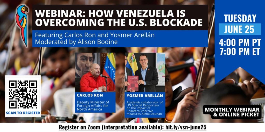 Join us for our next monthly picket/webinar featuring Venezuela’s Deputy Minister of Foreign Affairs for North America, Carlos Ron, and Yosmer Arellán, academic collaborator of UN Special Rapporteur on the impact of unilateral coercive measures, Alena Douhan, for a discussion on Venezuela’s resistance to U.S. hybrid warfare. Hear how the Venezuelan people and government have achieved remarkable economic progress and diplomatic success.