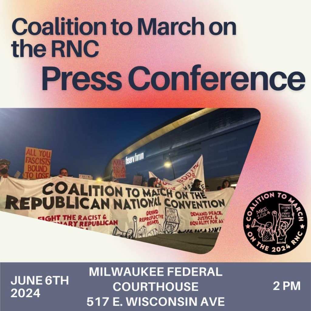 Categories Uncategorized Milwaukee, June 6, 2024: Coalition to March on the RNC Press Conference Post author By wibailoutpeople Post date June 4, 2024 Share this: Click to share on X (Opens in new window) X Click to share on Facebook (Opens in new window) Facebook Like Loading... Related ← June 25, 2024 Webinar: How Venezuela is Overcoming the U.S. Blockade → Milwaukee, June 5, 2024: Drop the Charges on Pro Palestine Protestors at UW-Milwaukee – Pack the Court