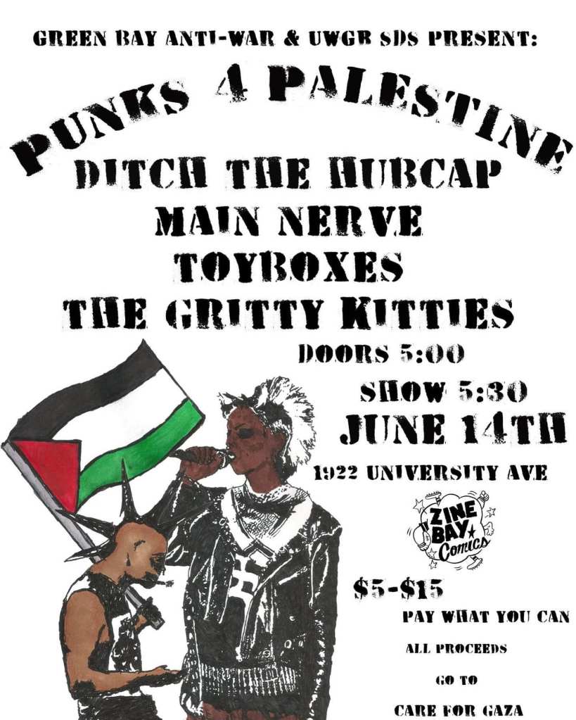 Categories Uncategorized Green Bay, June 14, 2024: Punks 4 Palestine Fundraiser Post author By wibailoutpeople Post date June 7, 2024 Share this: Click to share on X (Opens in new window) X Click to share on Facebook (Opens in new window) Facebook Like Loading... Related ← Lawsuit: ACLU and Coalition to March on the RNC → Appleton Bi-Weekly Free Palestine! Rallies