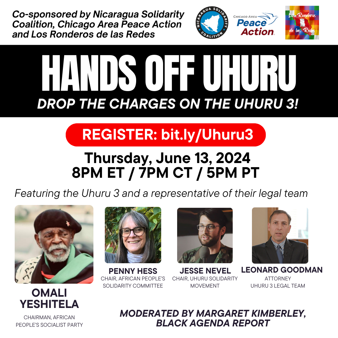 Categories Uncategorized Webinar June 13, 2024: Hands Off Uhuru! Drop the Charges Now! Post author By wibailoutpeople Post date June 7, 2024 https://zoom.us/webinar/register/WN_GpmBWbQkRP6zz0unzP1_Gg#/registration Share this: Click to share on X (Opens in new window) X Click to share on Facebook (Opens in new window) Facebook Like Loading... Related ← Solidarity with members of the International Union of Operating Engineers Local 139 on strike in SE Wisconsin → Milwaukee, Stand for Peace! Free Palestine! June 8 and 15, 2024