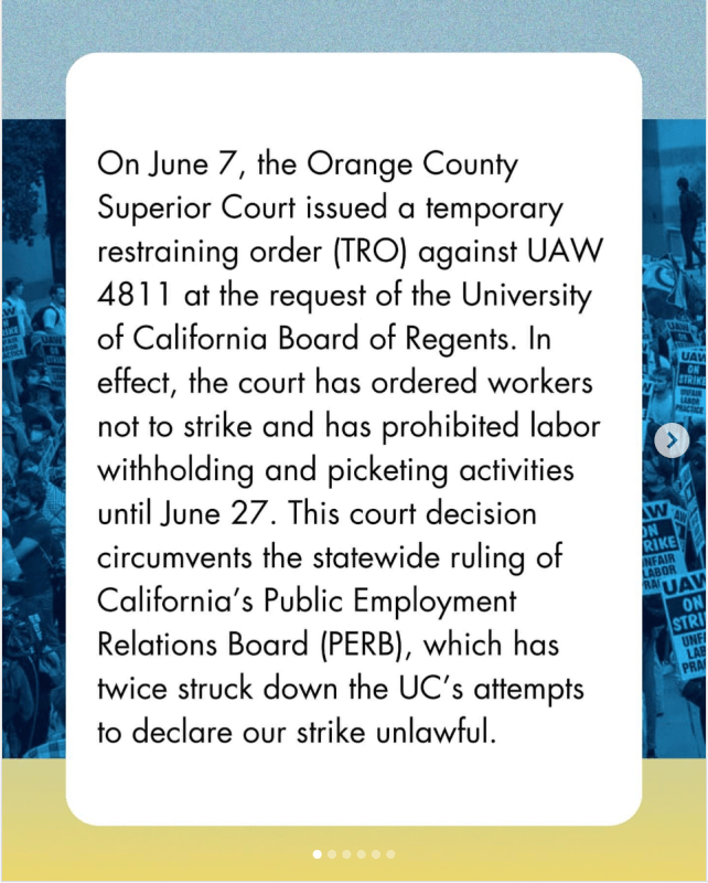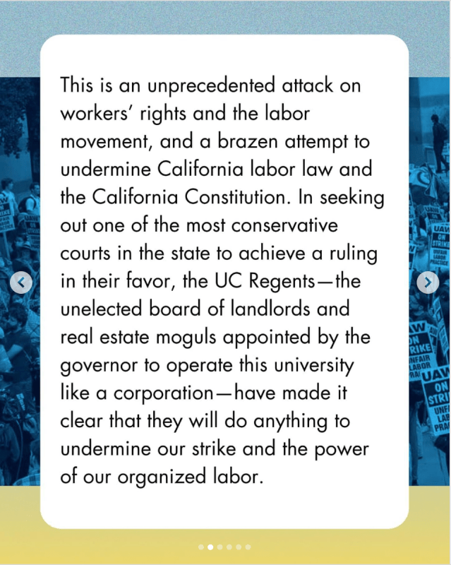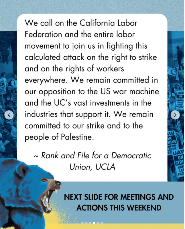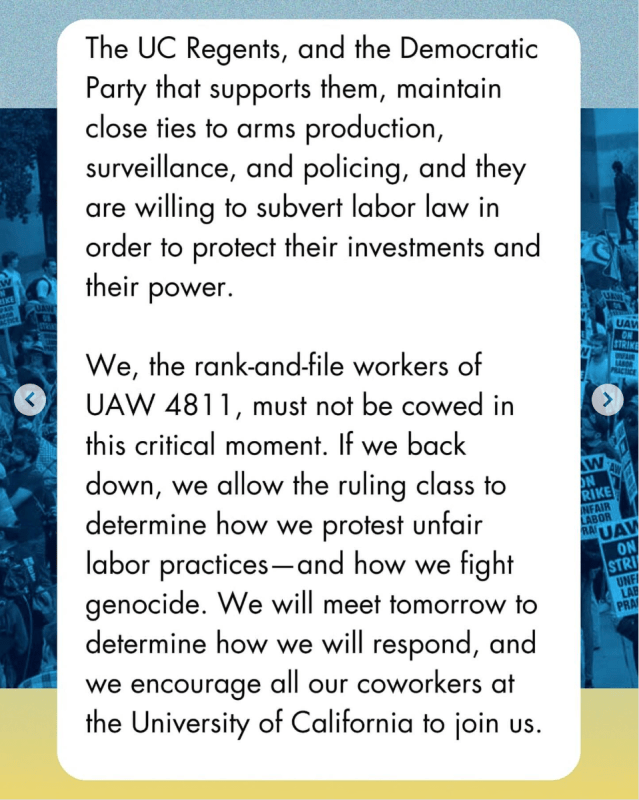 Categories Uncategorized Statement on TRO vs. UAW 4811 Strike (Rank and File for a Democratic Union, UCLA) Post author By wibailoutpeople Post date June 9, 2024 Statement on TRO vs. UAW 4811 Strike (Rank and File for a Democratic Union, UCLA) Share this: Click to share on X (Opens in new window) X Click to share on Facebook (Opens in new window) Facebook Like Loading... Related ← GEO Statement of Solidarity with UAW 4811 → Milwaukee, July 14, 2024: Community Fundraiser Dinner with the Screening of ‘Resilient Smiles’
